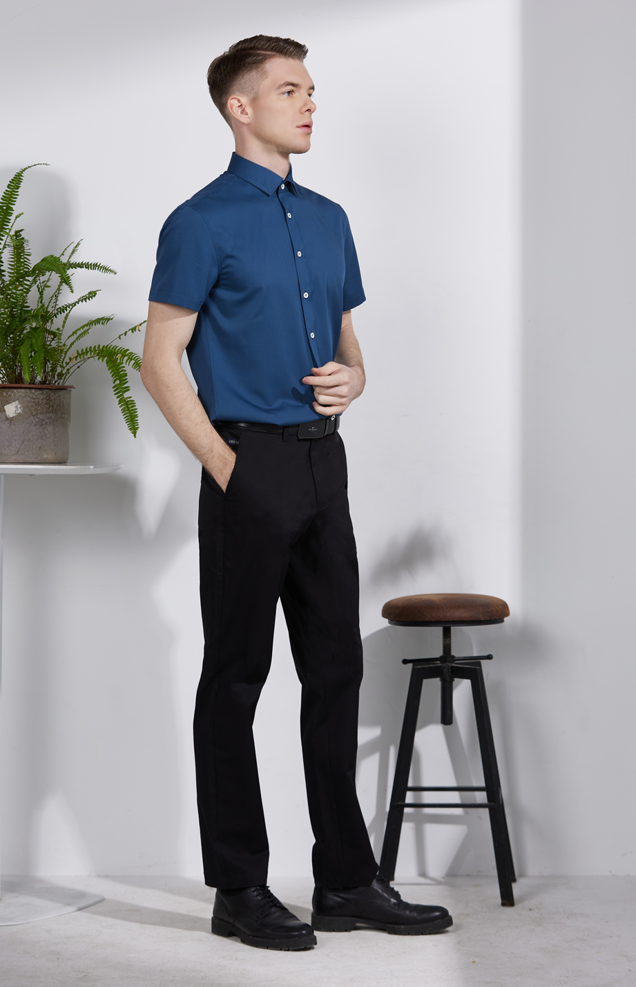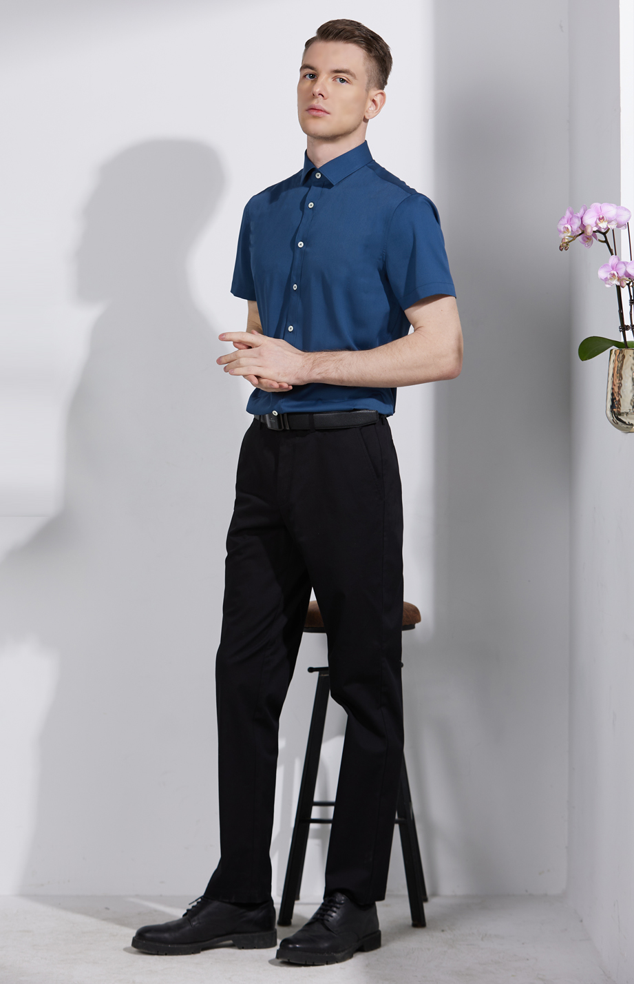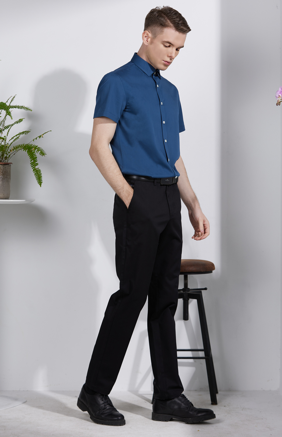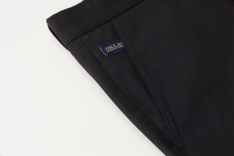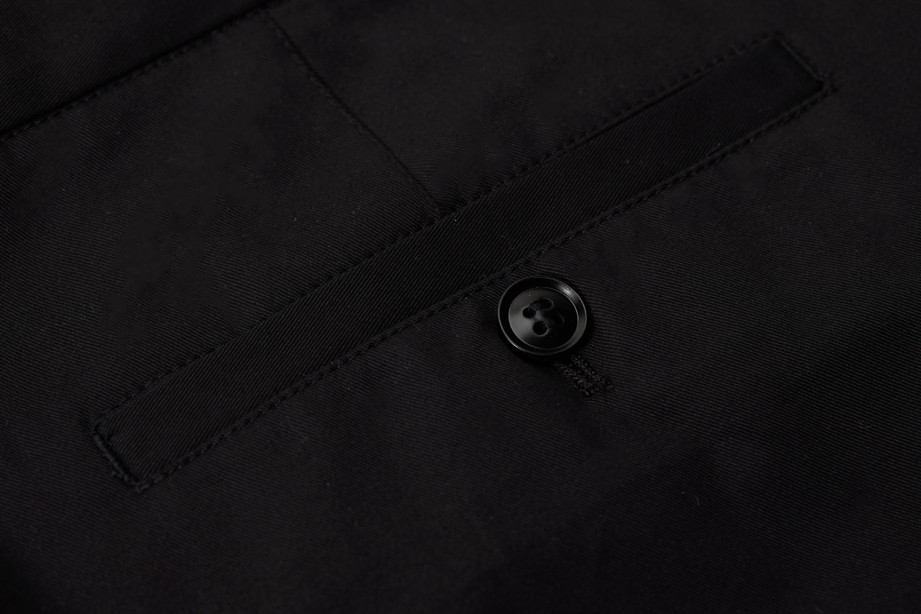 经典腰头设计,平整有型;圆润富有光泽的树脂纽扣,精致美观,十字走线防脱落。