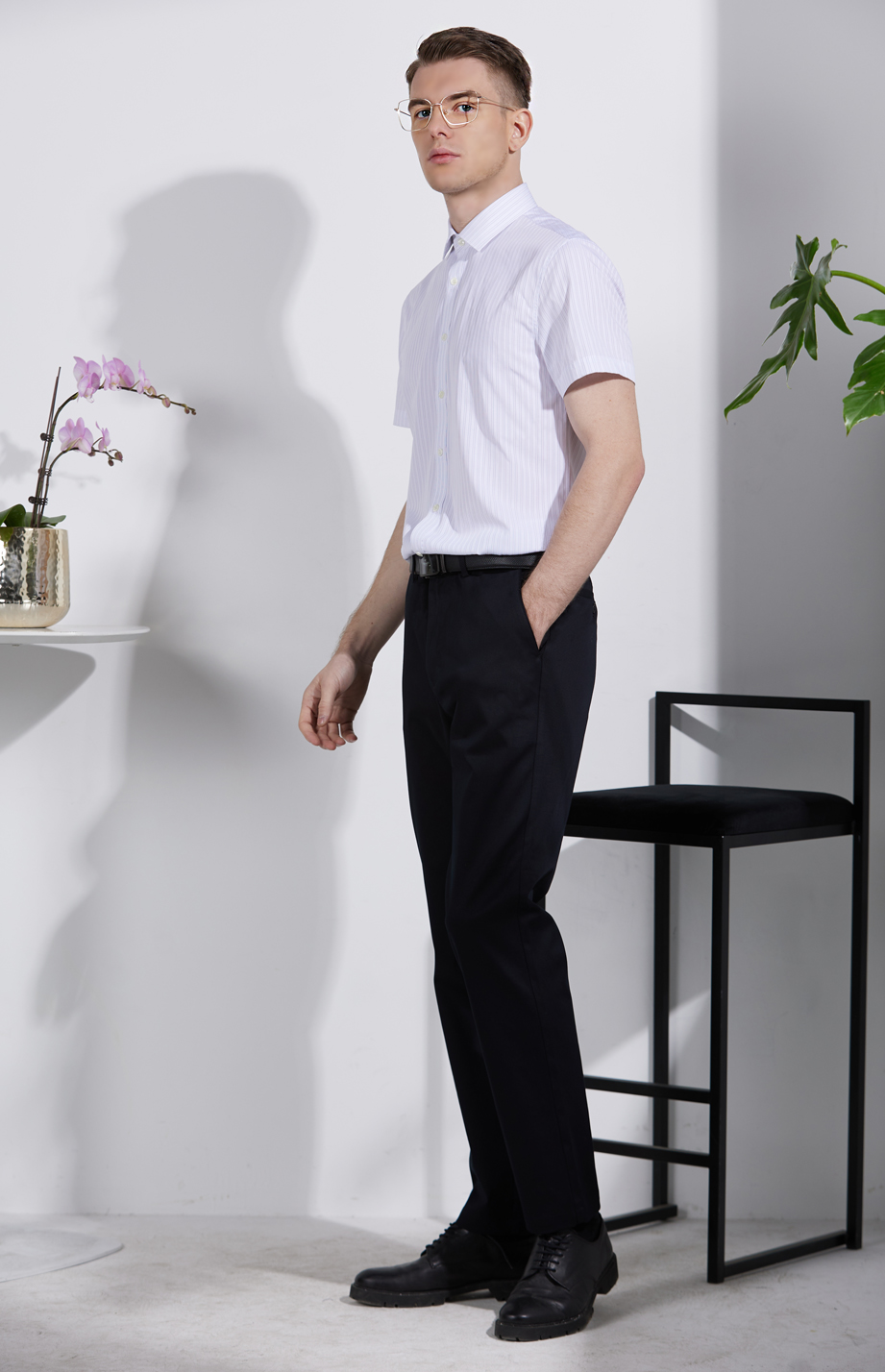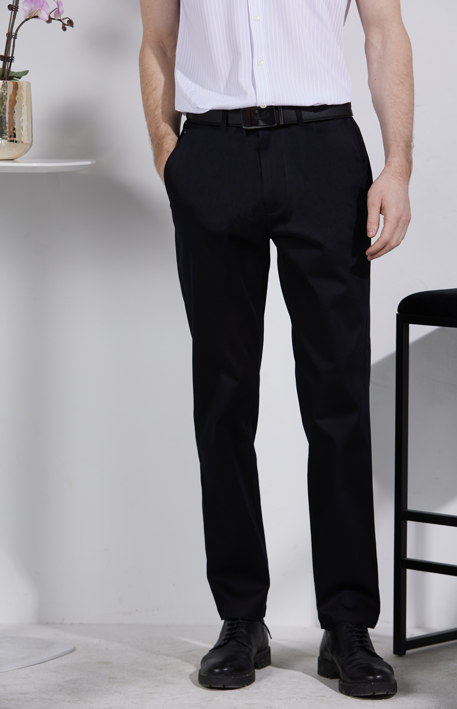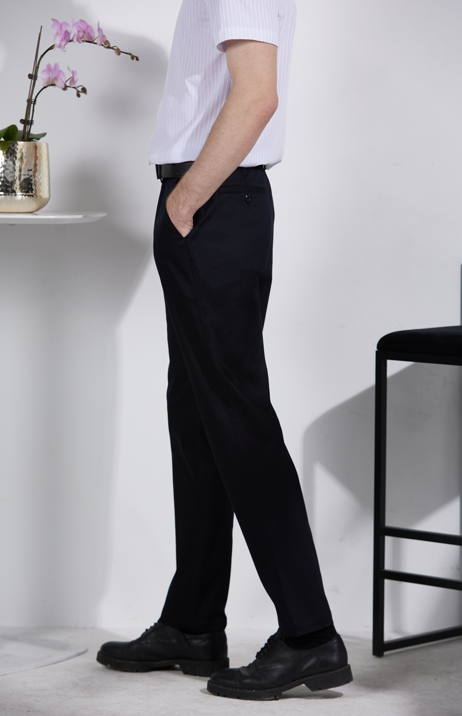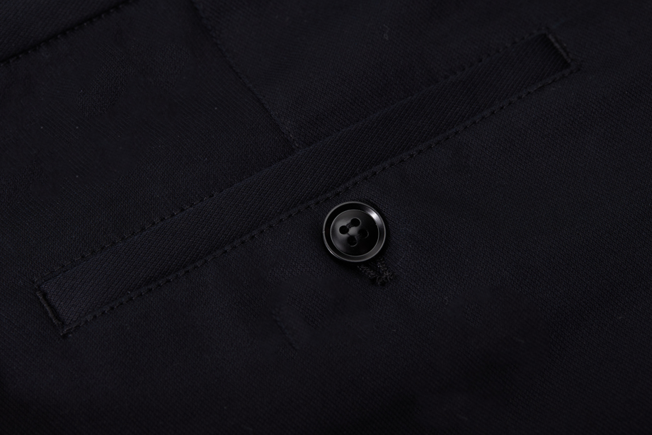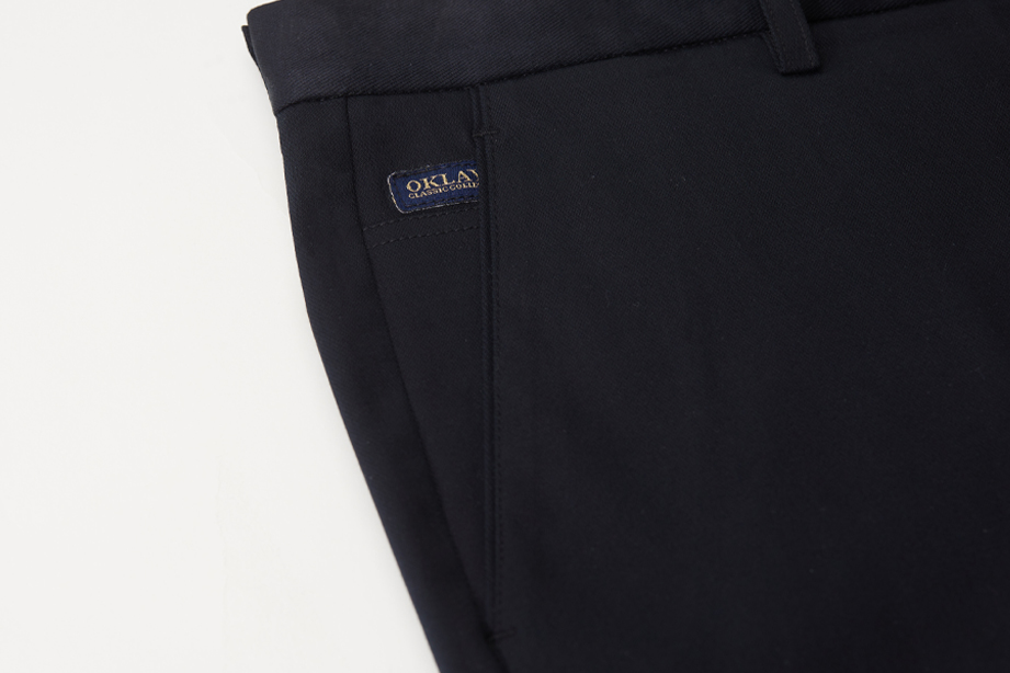 经典腰头设计,平整有型;圆润富有光泽的树脂纽扣,精致美观,十字走线防脱落。