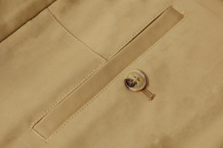 经典腰头设计,平整有型;圆润富有光泽的树脂纽扣,精致美观,十字走线防脱落。