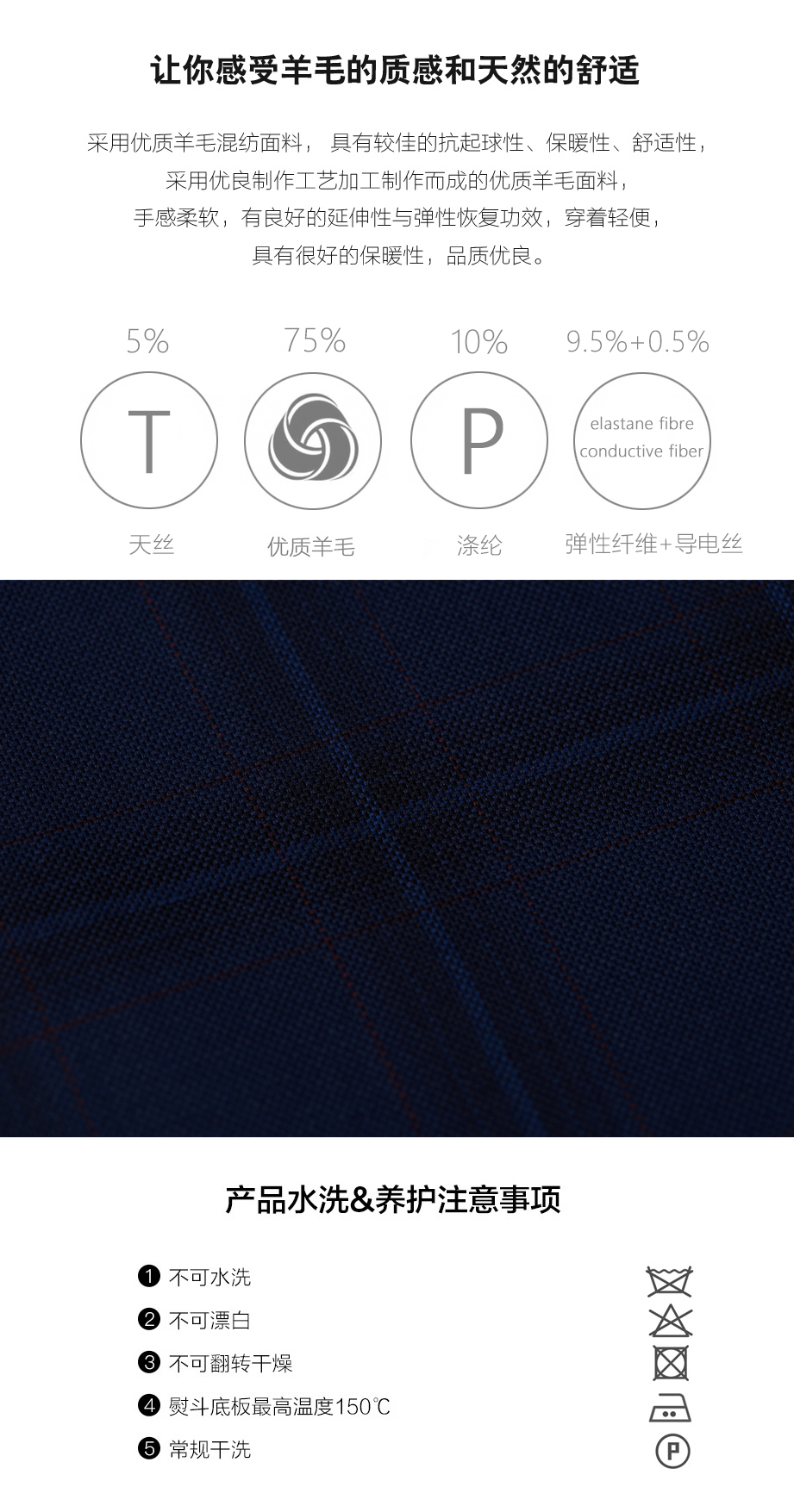 | 面料: | 75%毛10%涤纶5%天丝9.5%弹性纤维0.5%导电丝 | |||