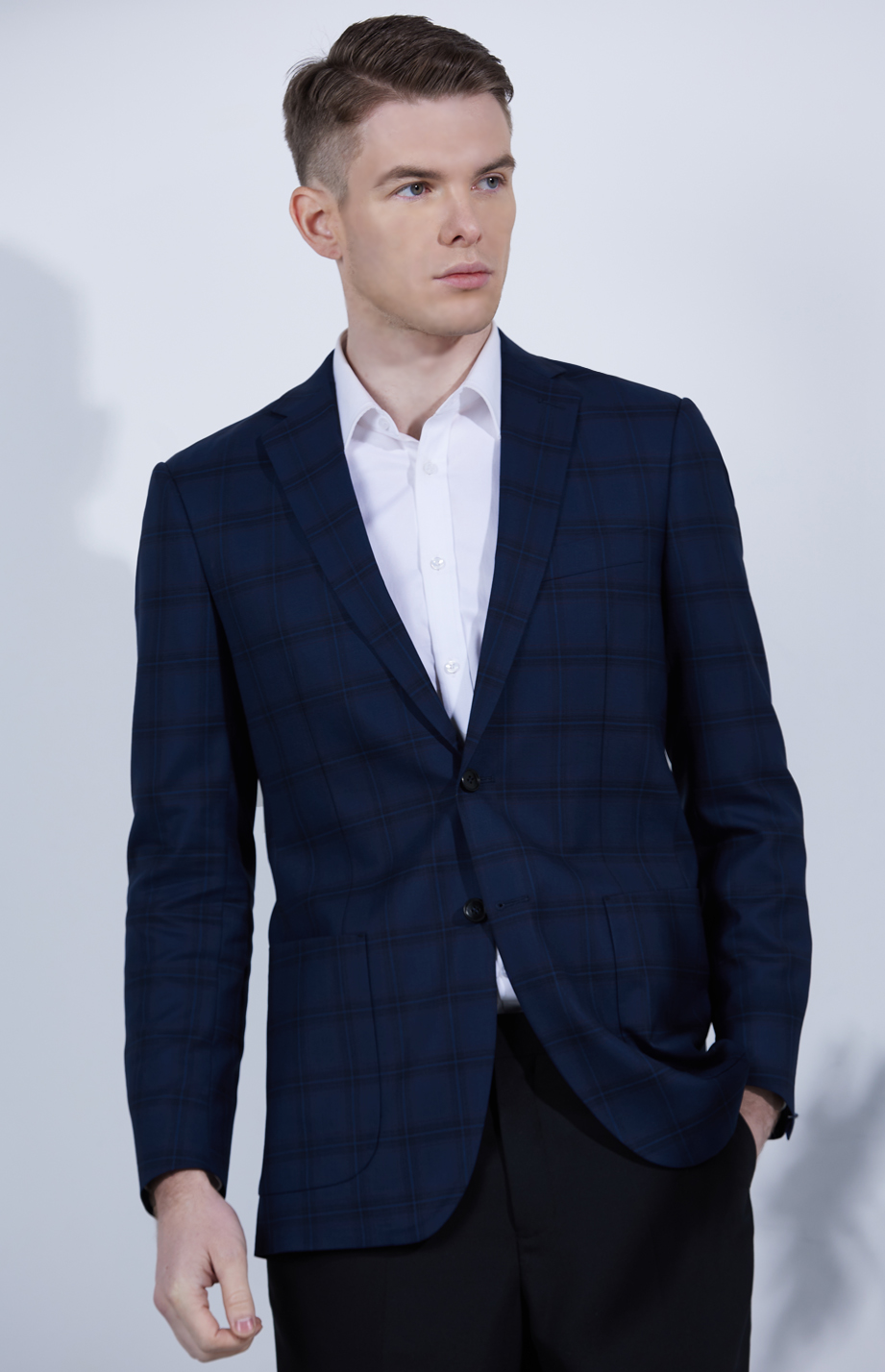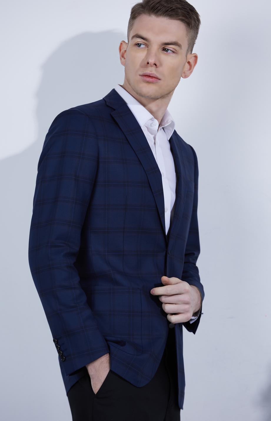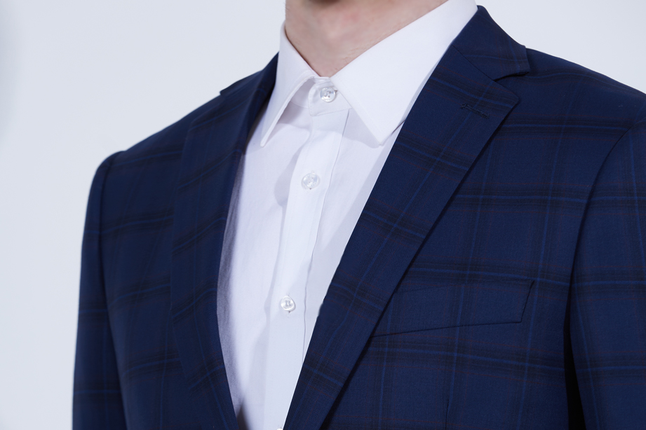 海军蓝底红蓝细格毛涤天丝混纺微弹平驳头商务休闲单西 |