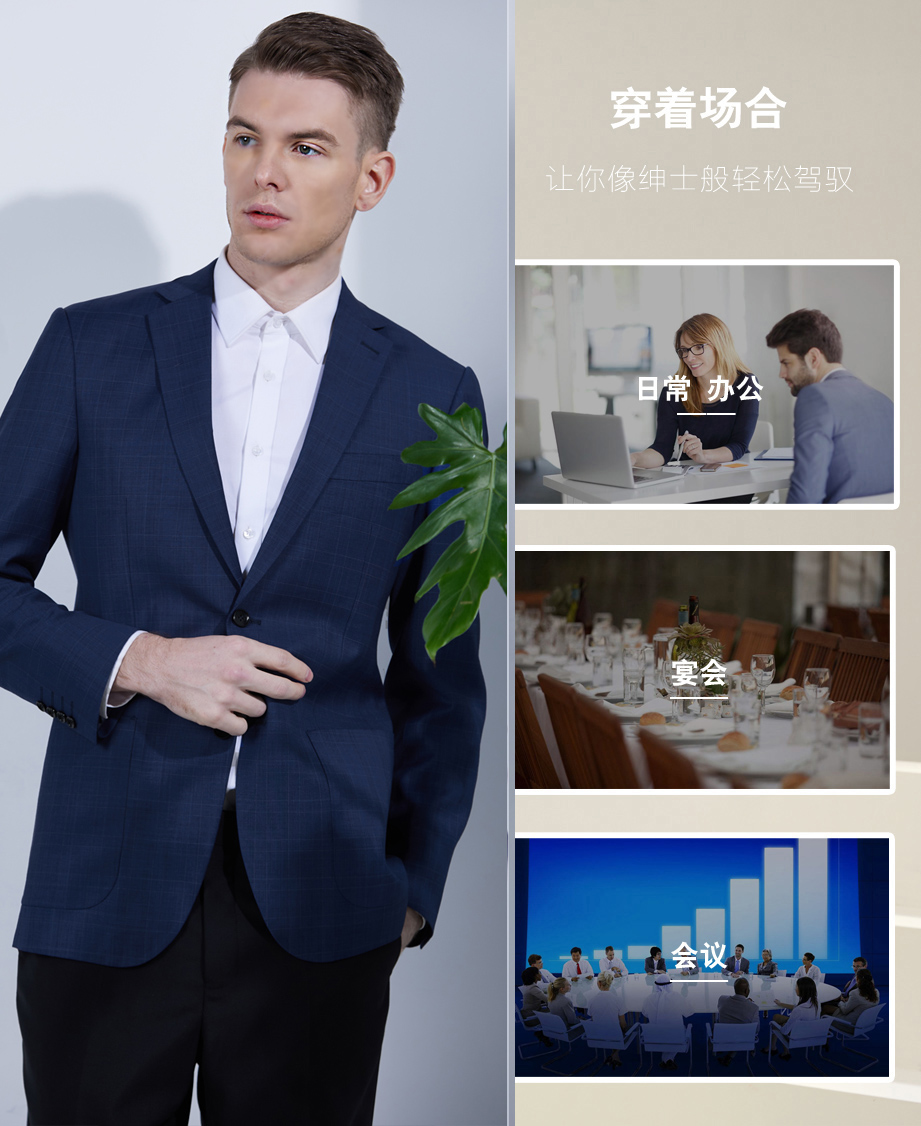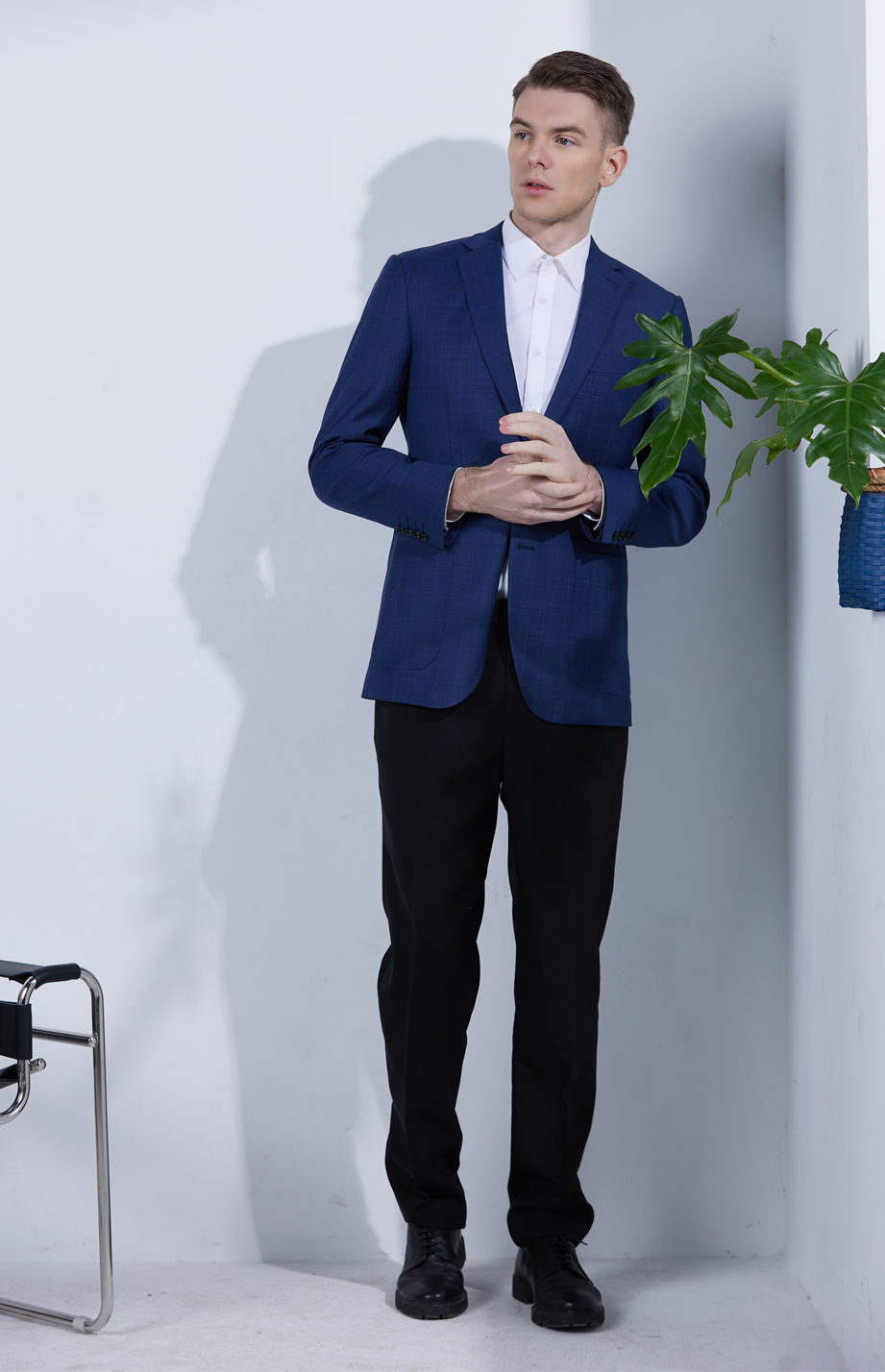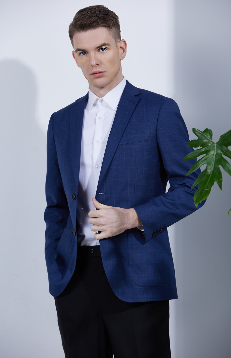 | 款名: | 宝蓝底灰色深蓝格子毛涤混纺平驳头商务休闲单西 | |||