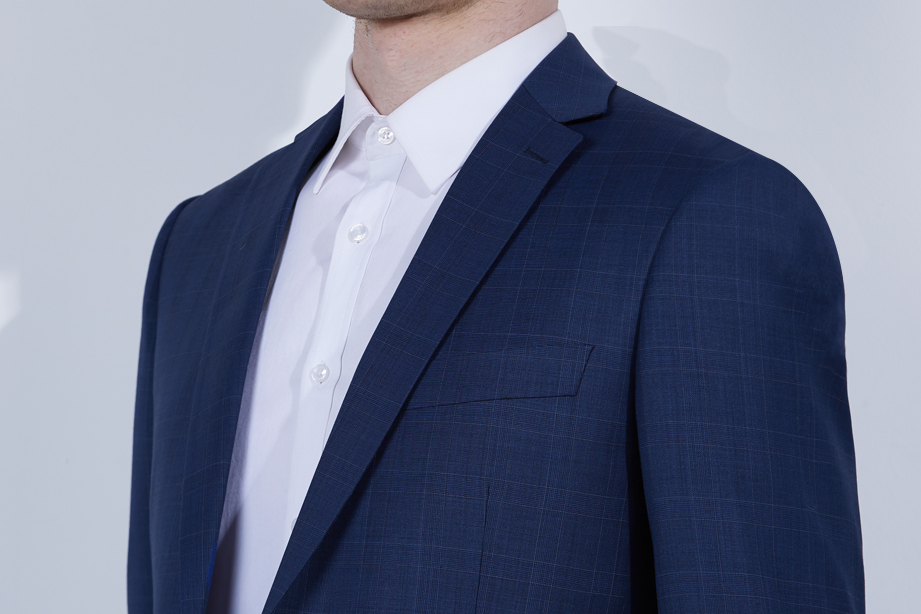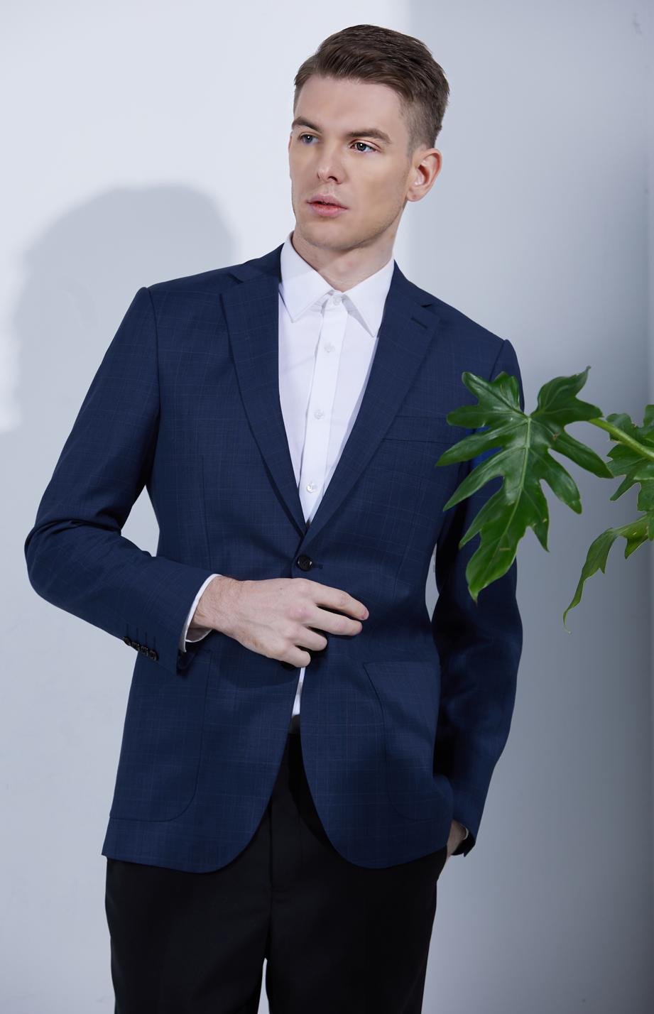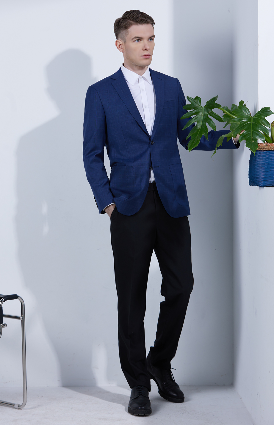 | 款名: | 宝蓝底灰色深蓝格子毛涤混纺平驳头商务休闲单西 | |||