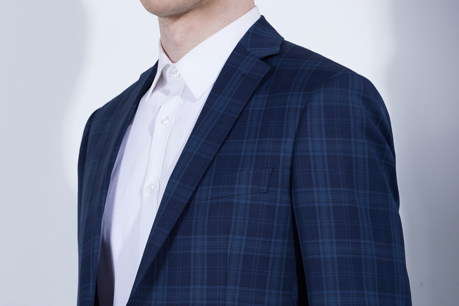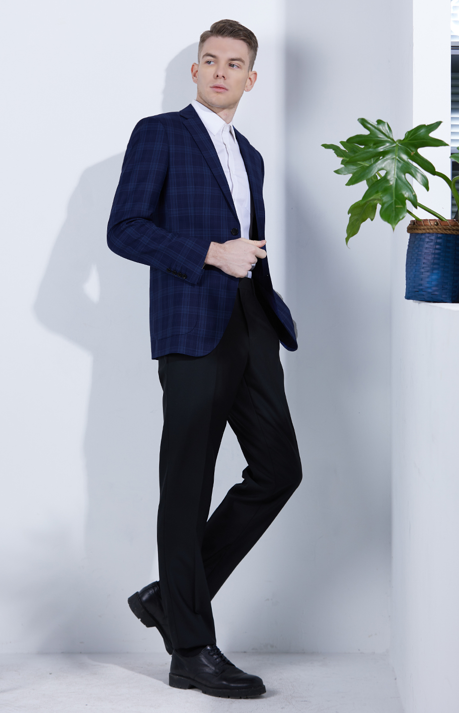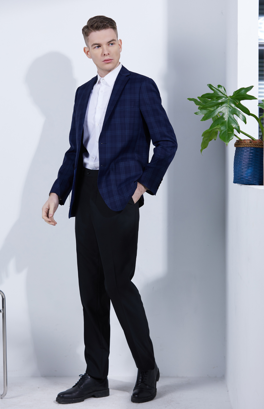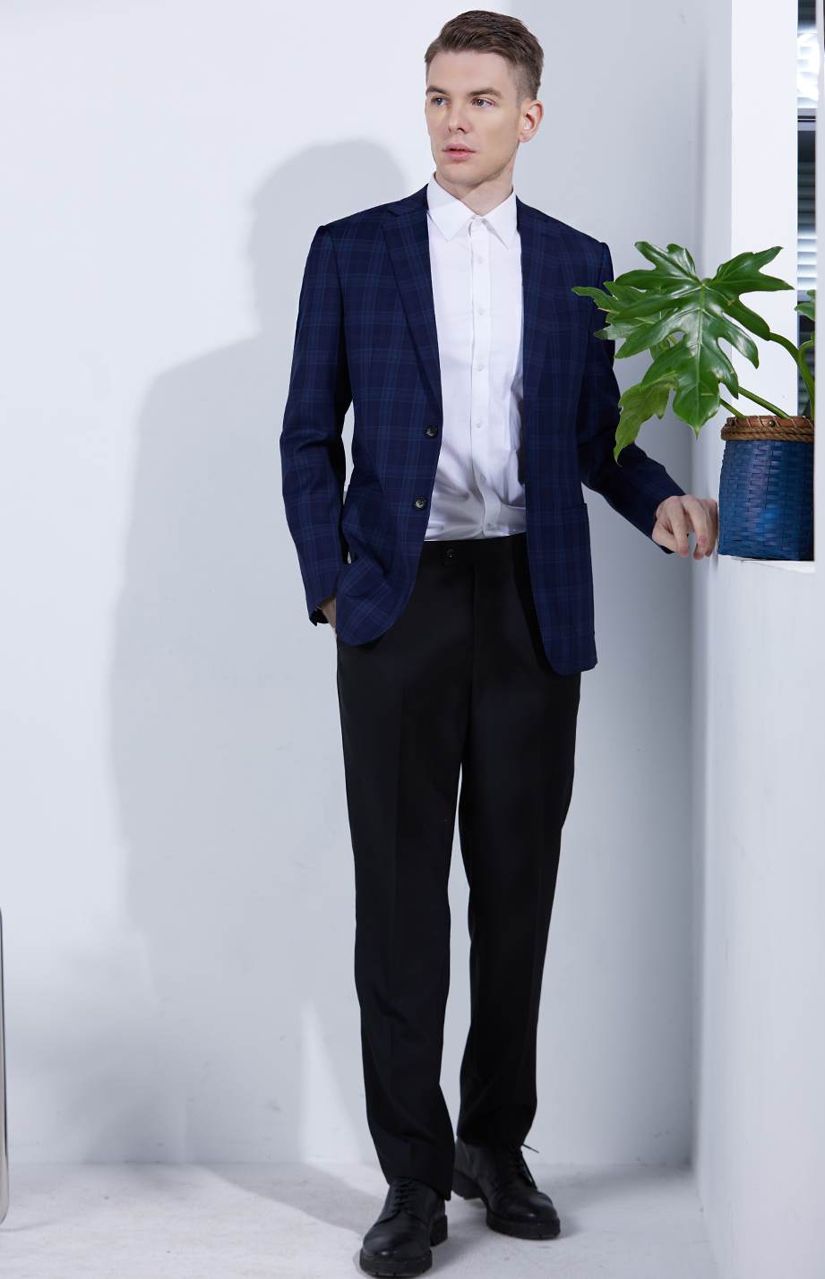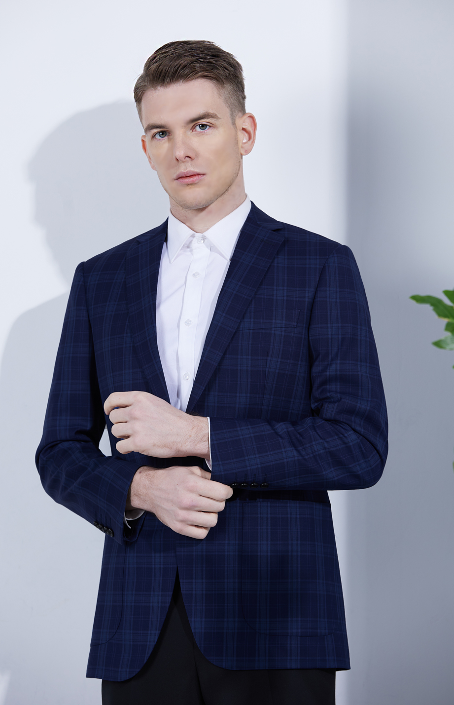 | 款名: | 深蓝底中蓝格毛涤混纺平驳头商务休闲单西 | |||