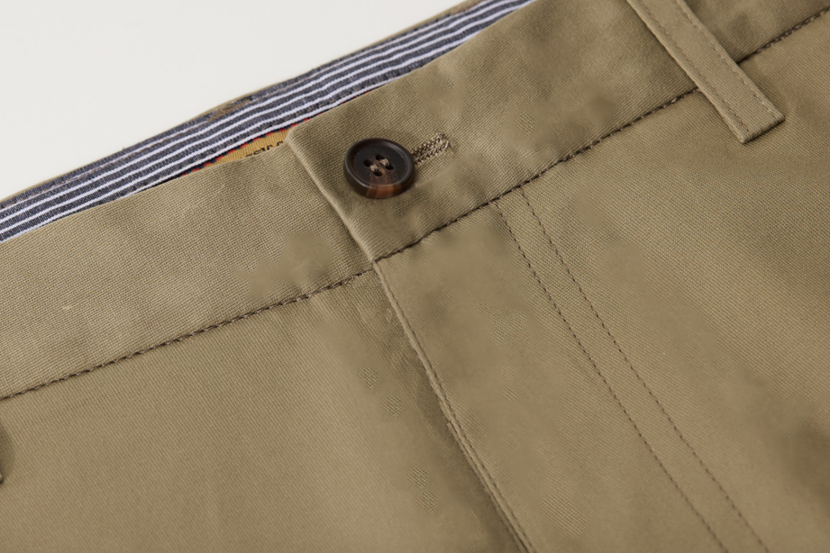 经典腰头设计,平整有型;圆润富有光泽的树脂纽扣,精致美观,十字走线防脱落。