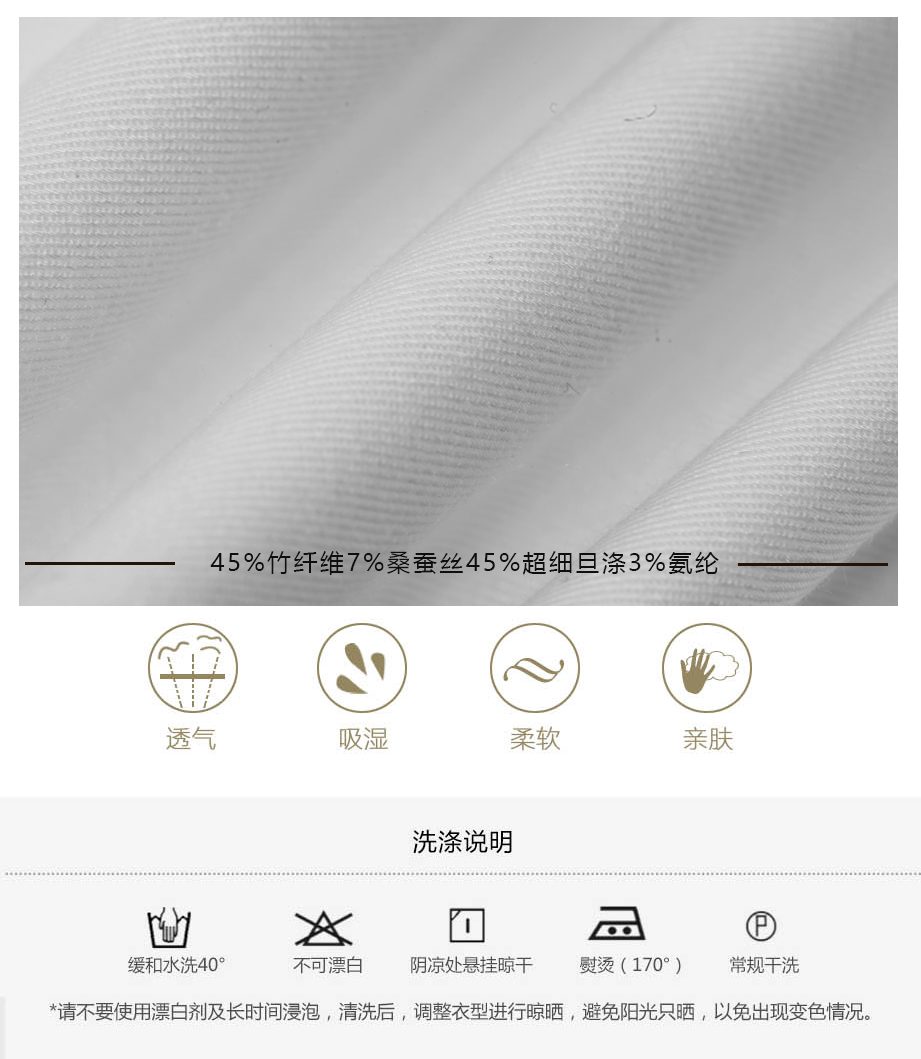 | 面料: | 45%竹纤维7%桑蚕丝45%超细旦涤3%氨纶 | |||