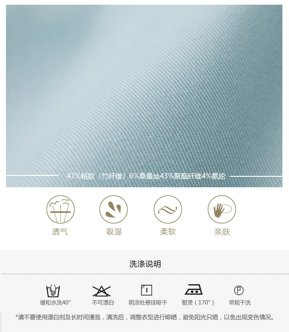 | 面料: | 46.6%粘胶(竹)纤维5.1%桑蚕丝44.5%聚酯纤维3.8%氨纶 | |||