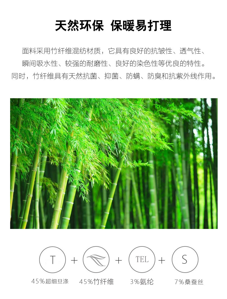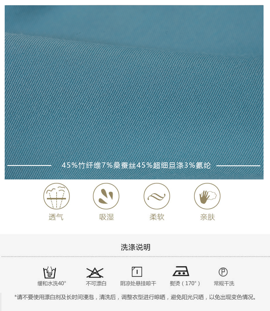 | 面料: | 45%竹纤维7%桑蚕丝45%超细旦涤3%氨纶 | |||