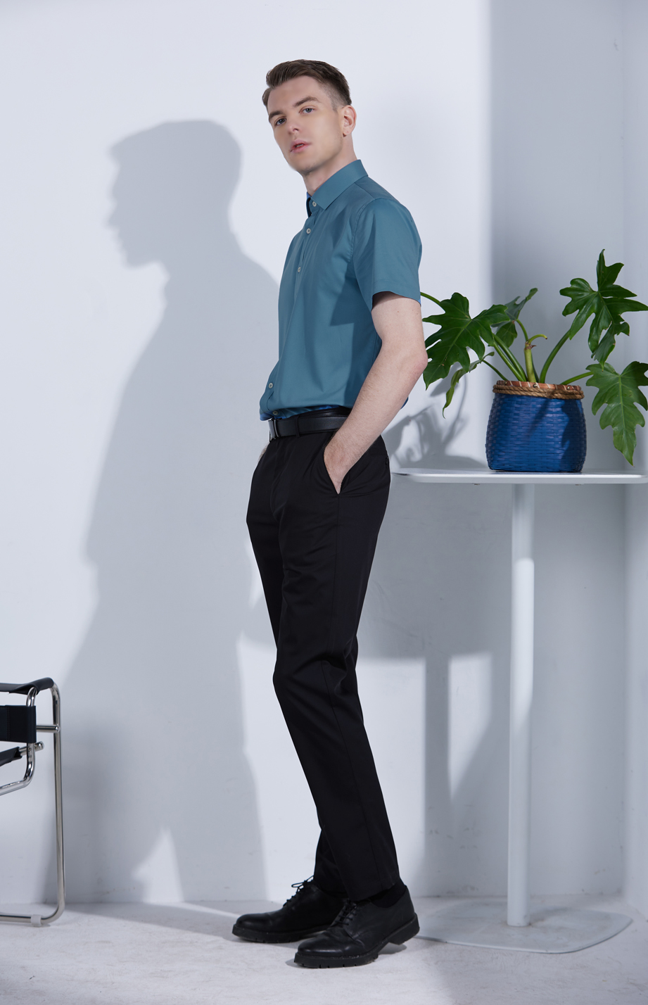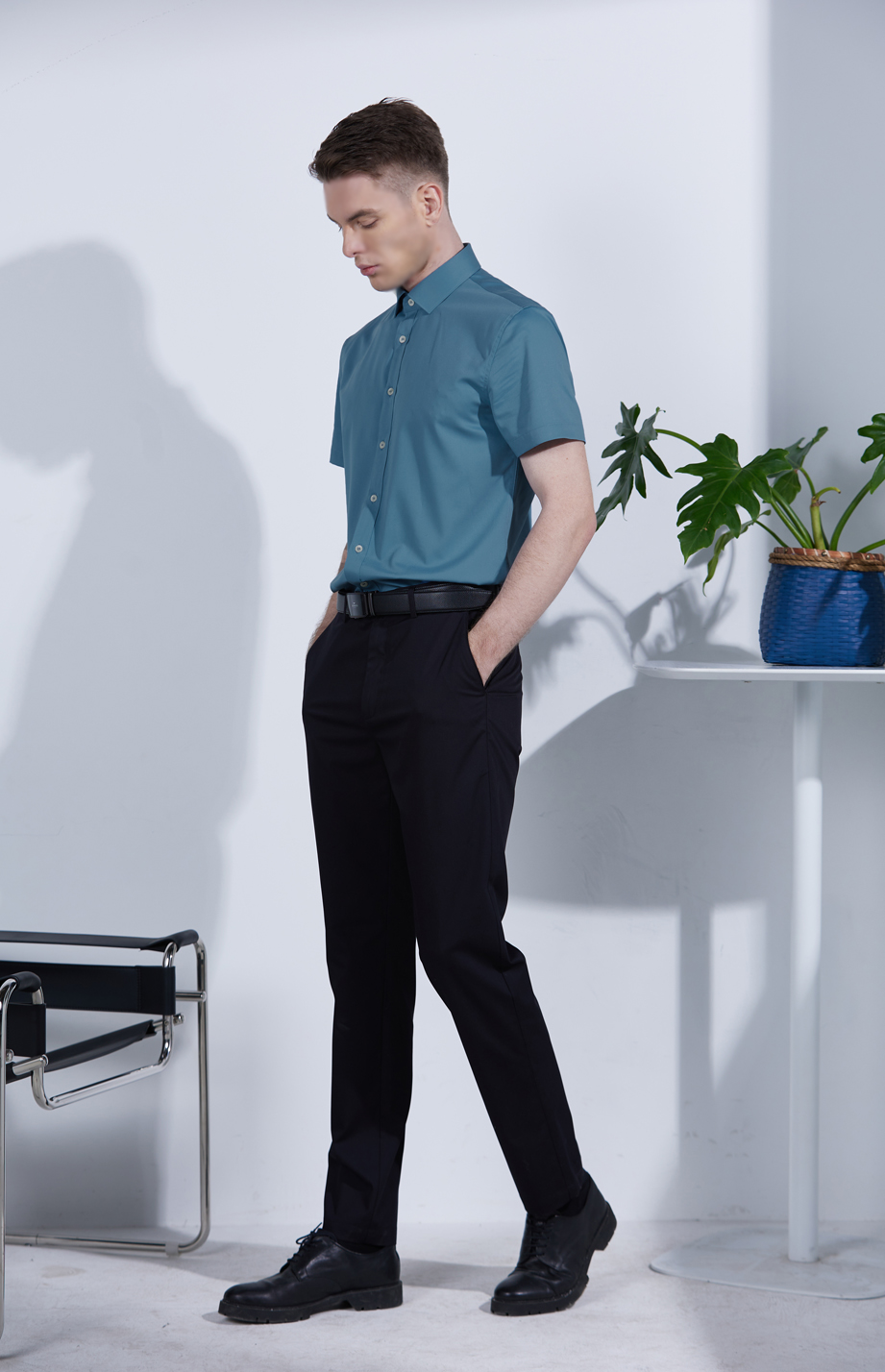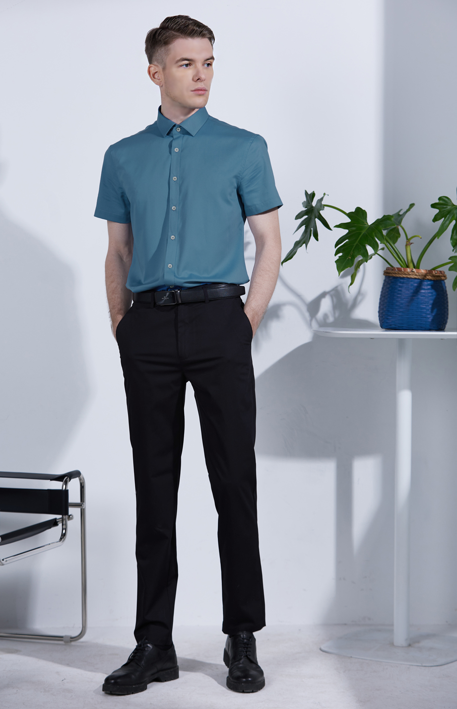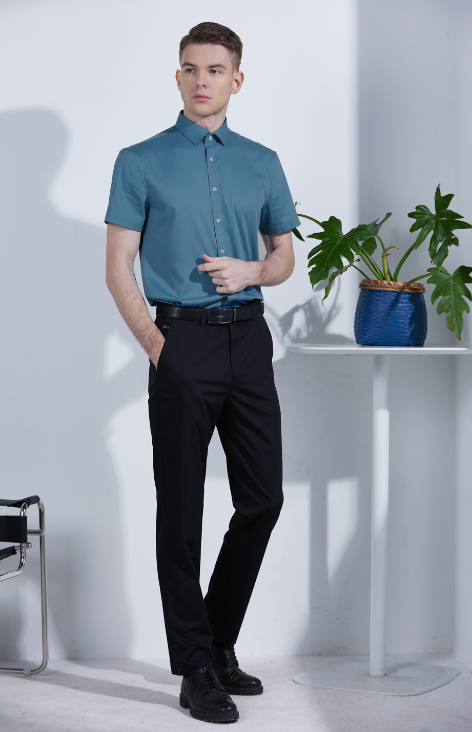 经典腰头设计,平整有型;圆润富有光泽的树脂纽扣,精致美观,十字走线防脱落。