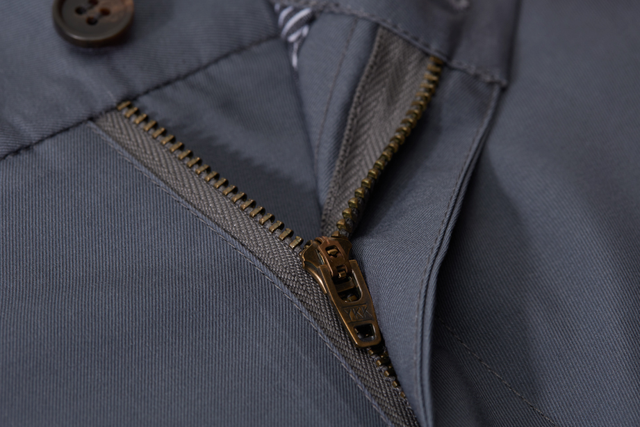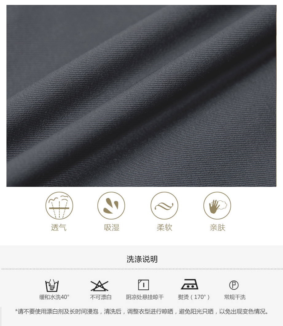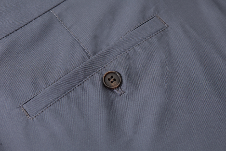 经典腰头设计,平整有型;圆润富有光泽的树脂纽扣,精致美观,十字走线防脱落。