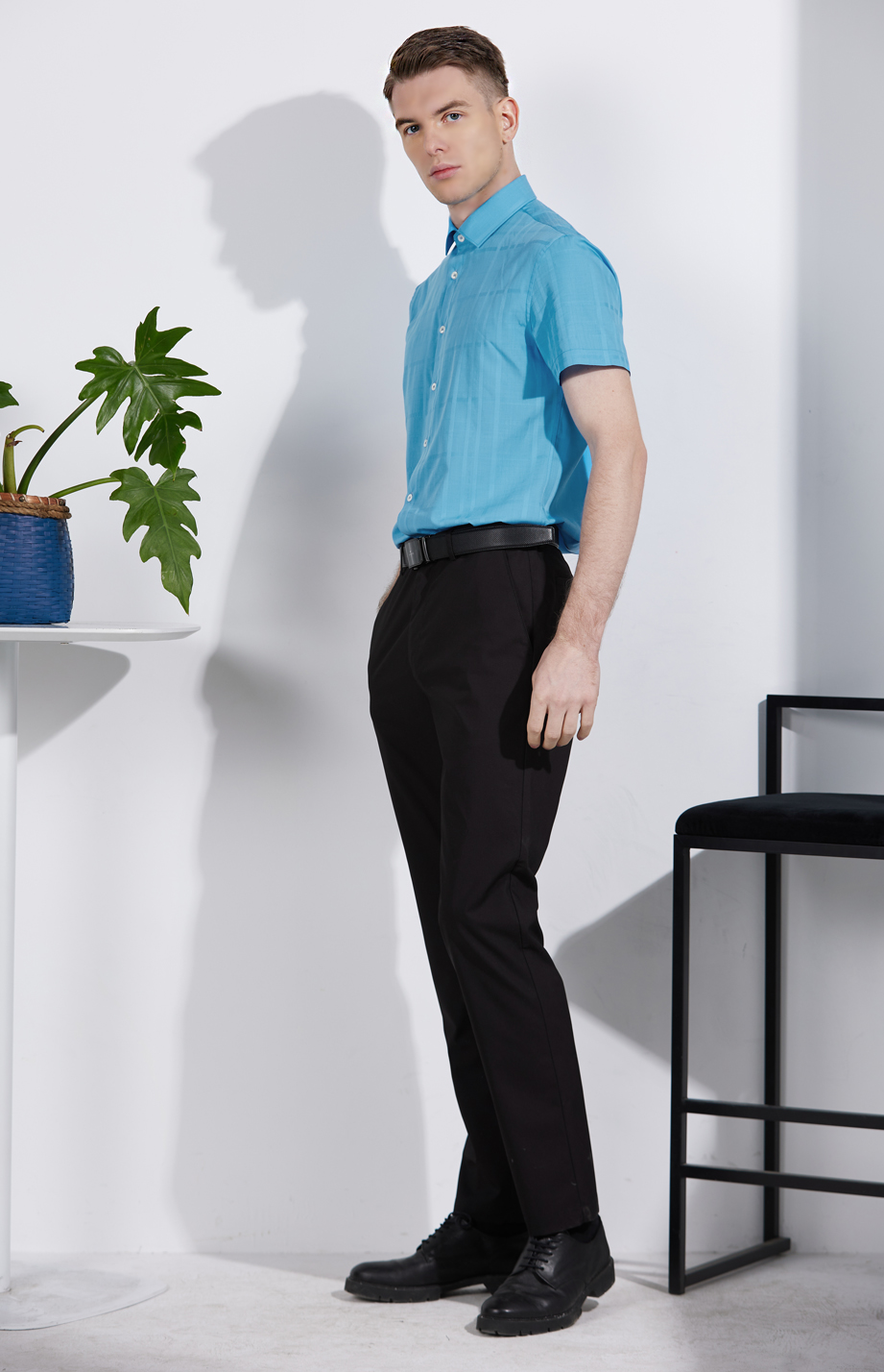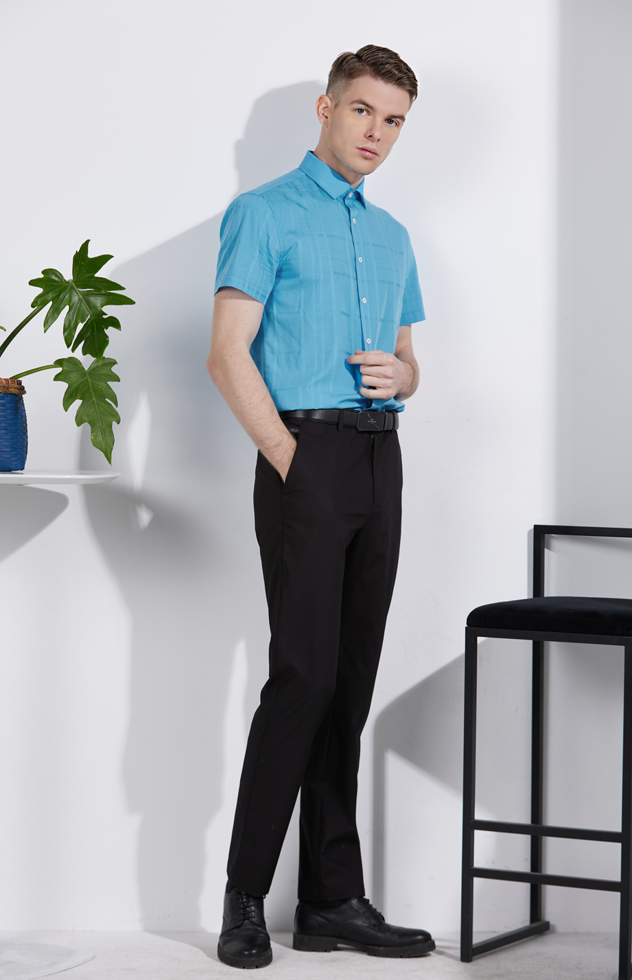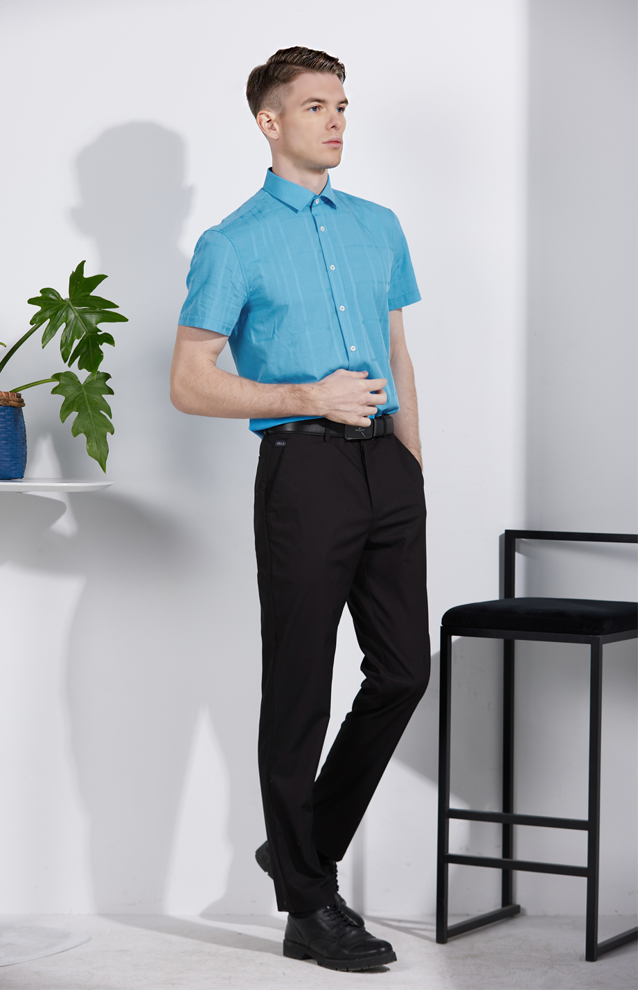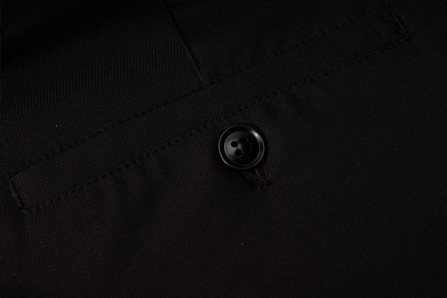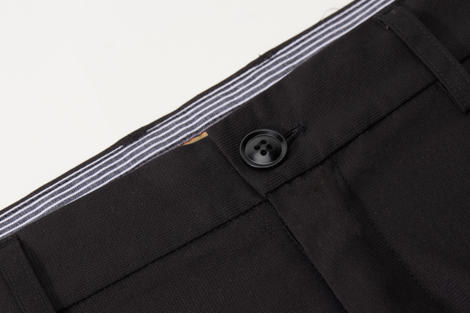 经典腰头设计,平整有型;圆润富有光泽的树脂纽扣,精致美观,十字走线防脱落。