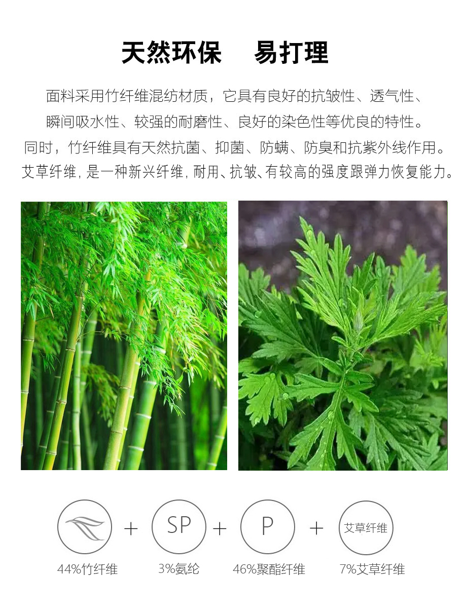 | 面料: | 44%竹纤维46%聚酯纤维7%艾草纤维3%氨纶 | |||