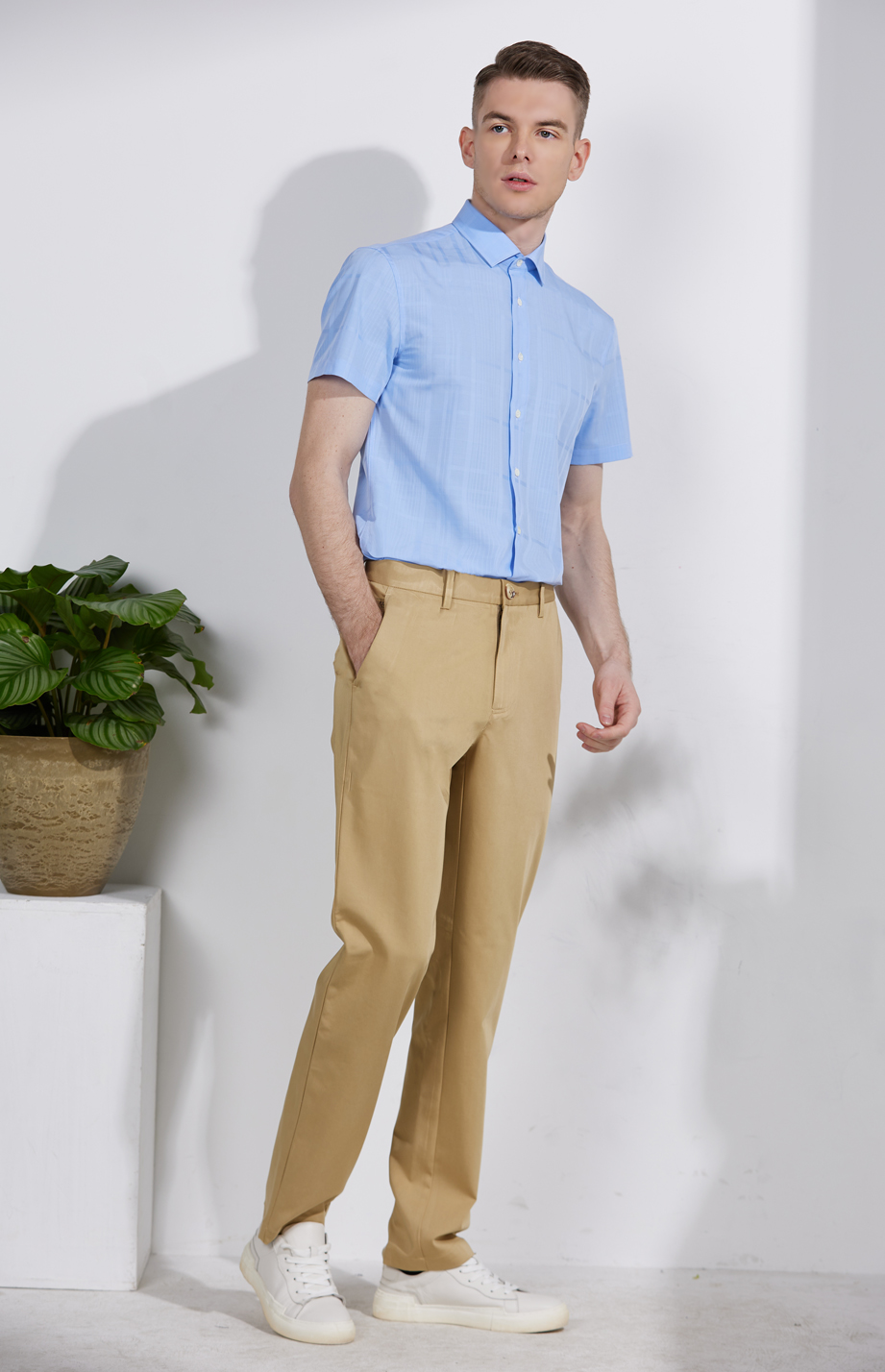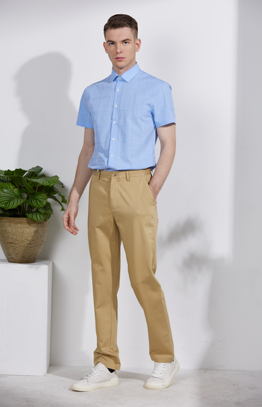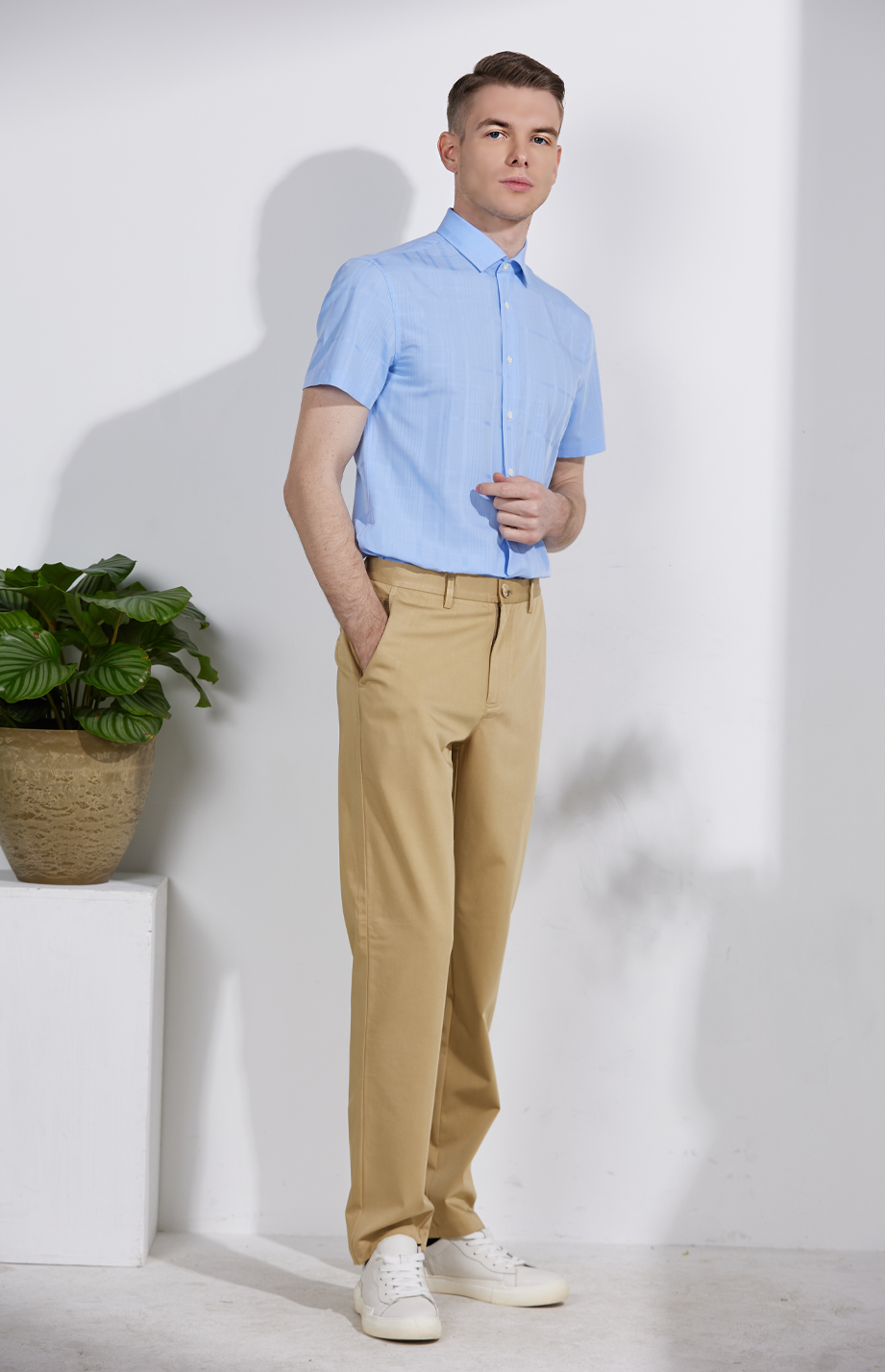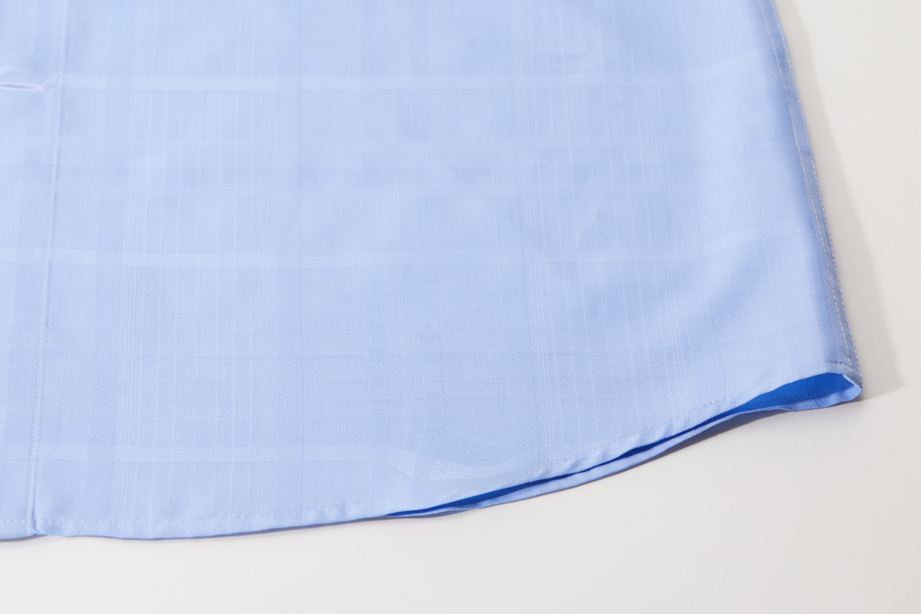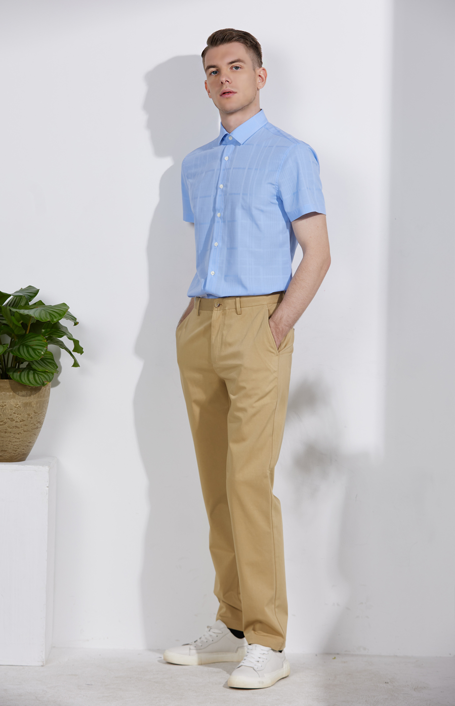 | 款名: | 浅蓝竹纤维聚酯纤维混纺提花大格短袖衬衫 | |||||