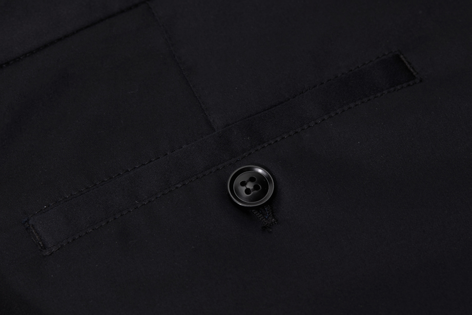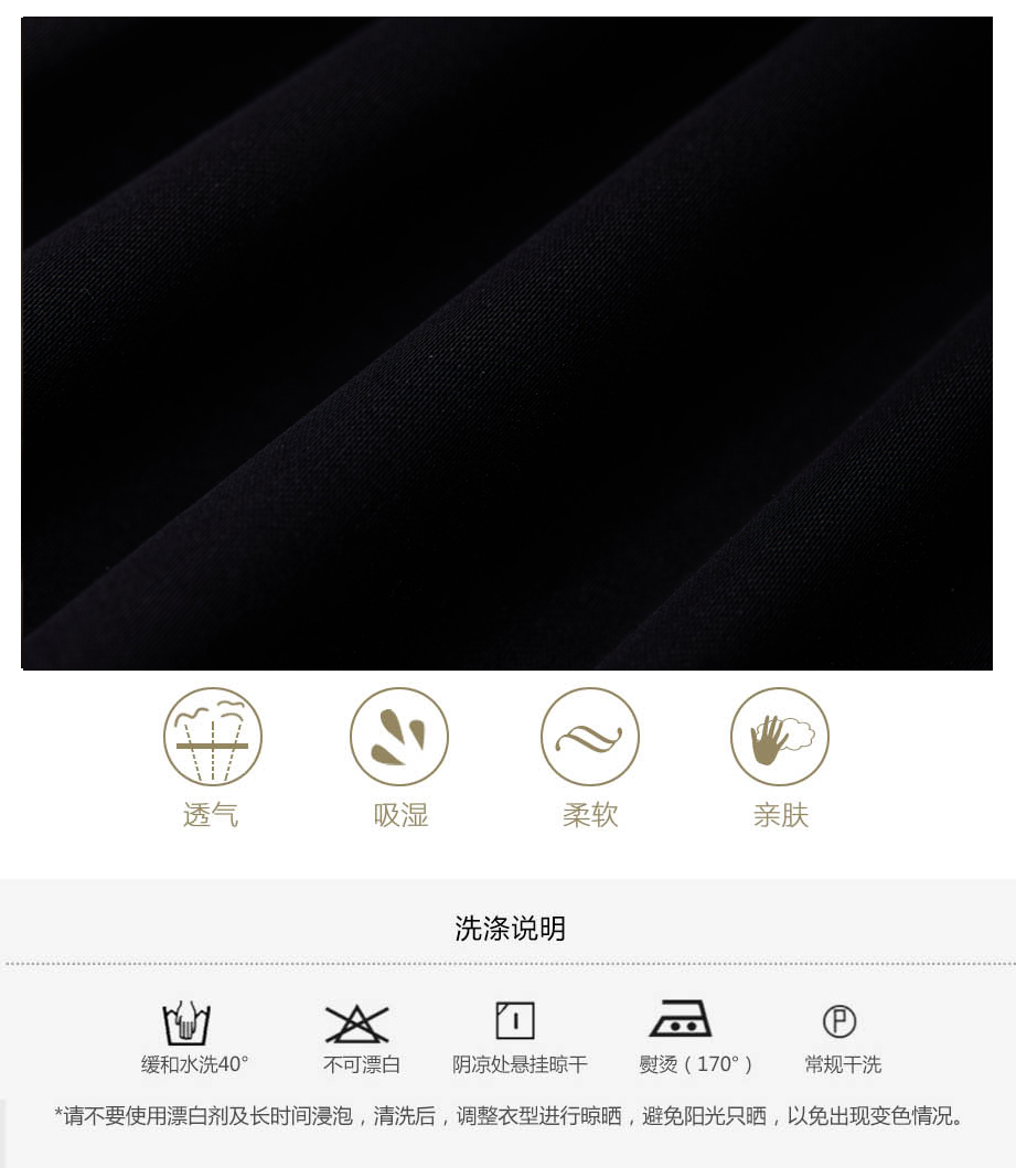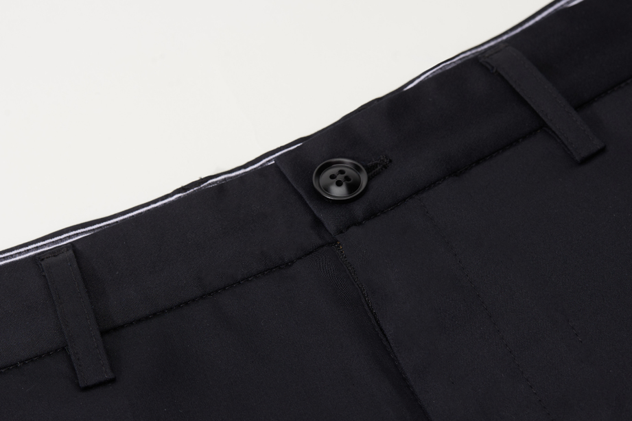 经典腰头设计,平整有型;圆润富有光泽的树脂纽扣,精致美观,十字走线防脱落。