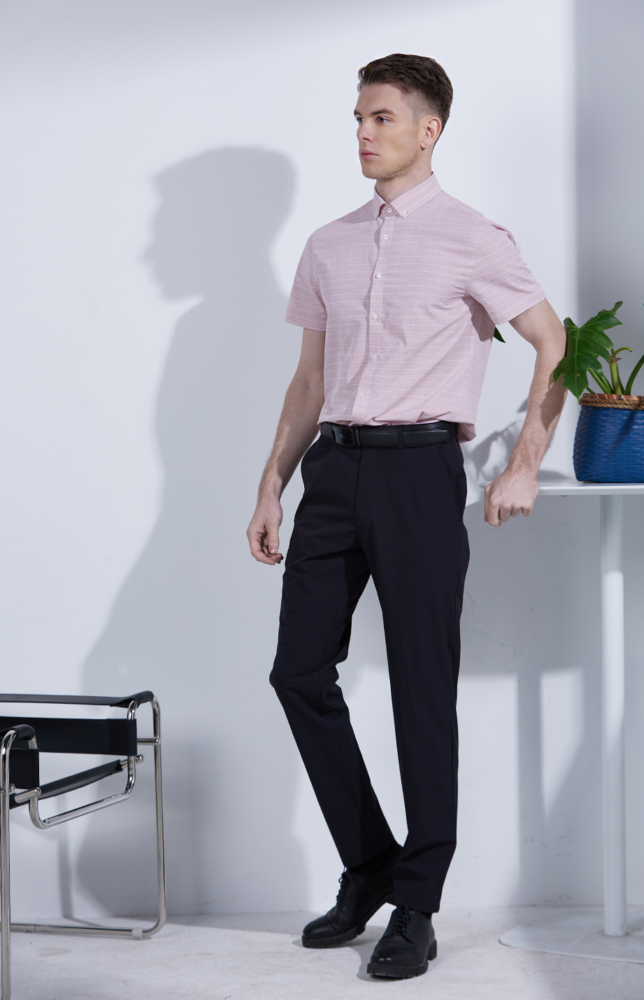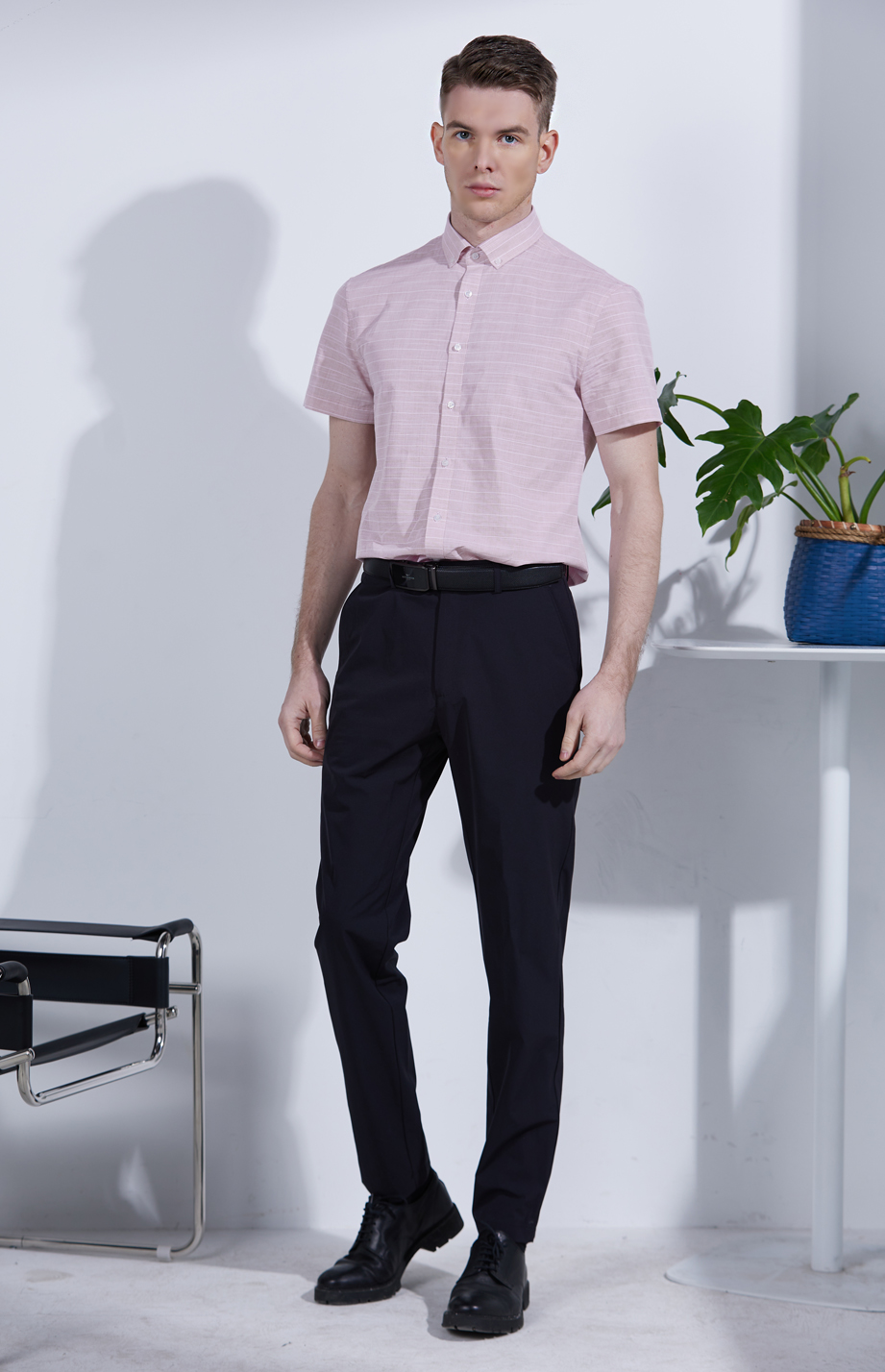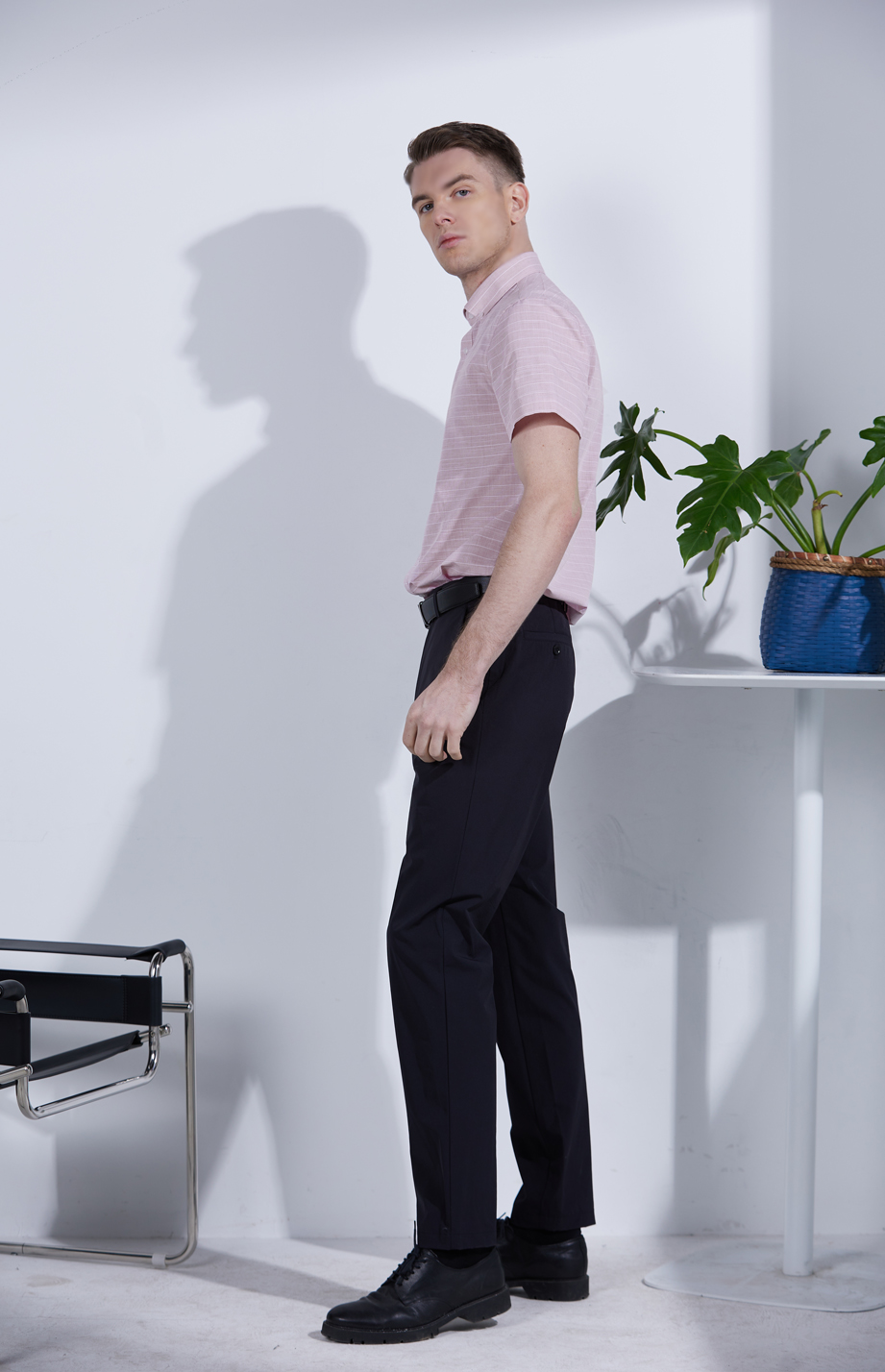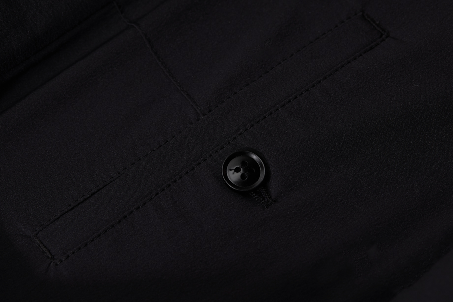 经典腰头设计,平整有型;圆润富有光泽的树脂纽扣,精致美观,十字走线防脱落。