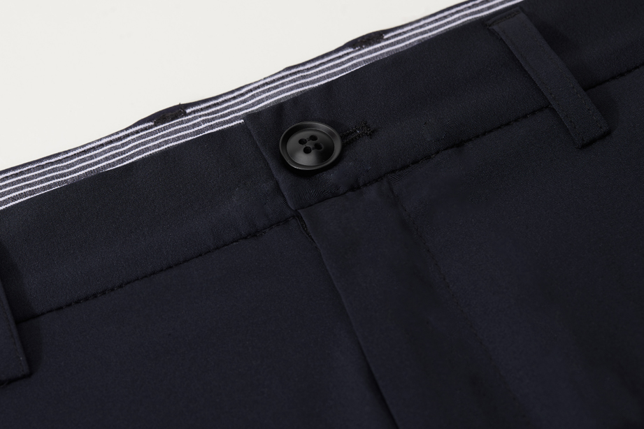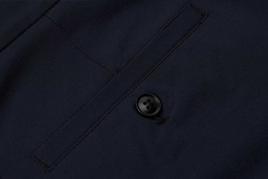 经典腰头设计,平整有型;圆润富有光泽的树脂纽扣,精致美观,十字走线防脱落。