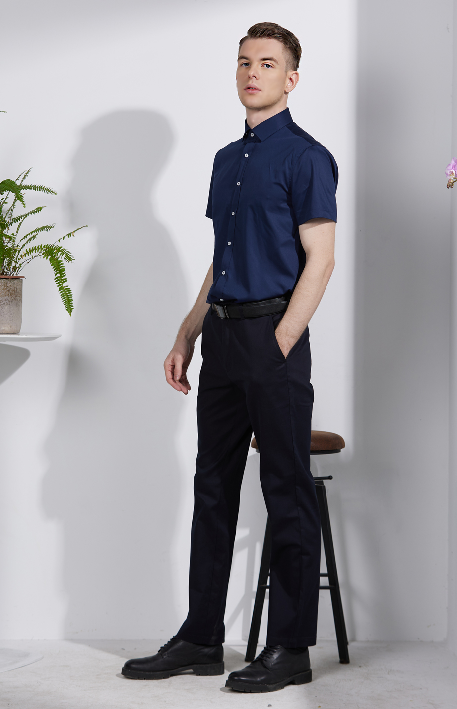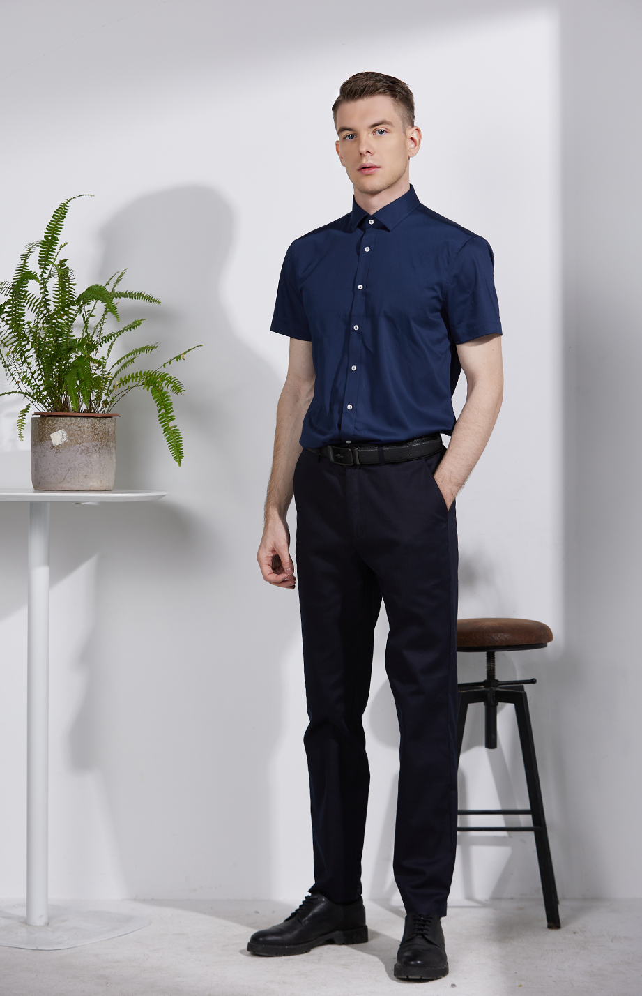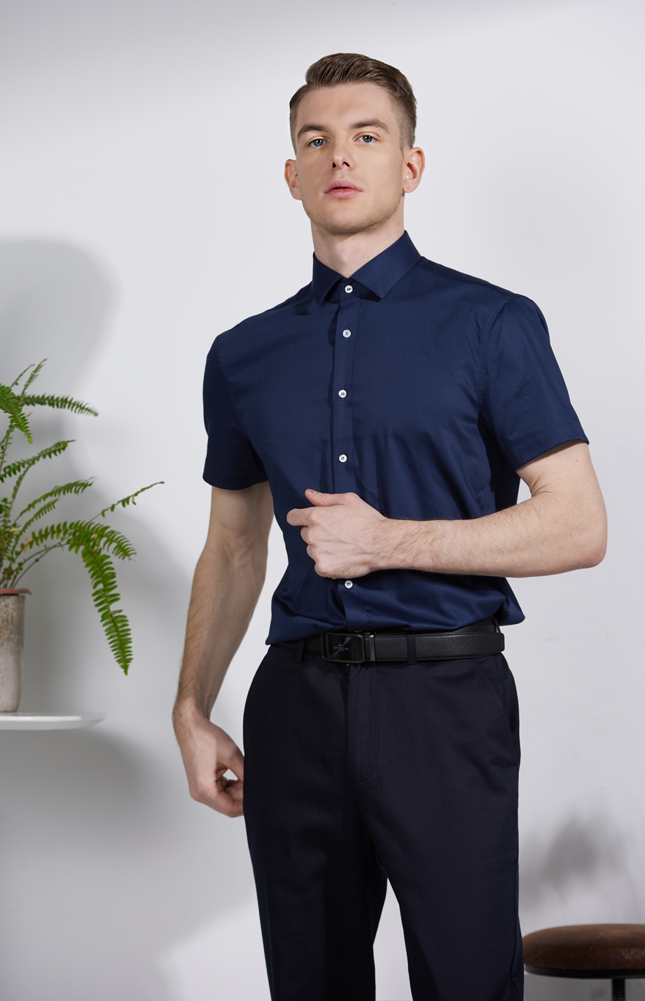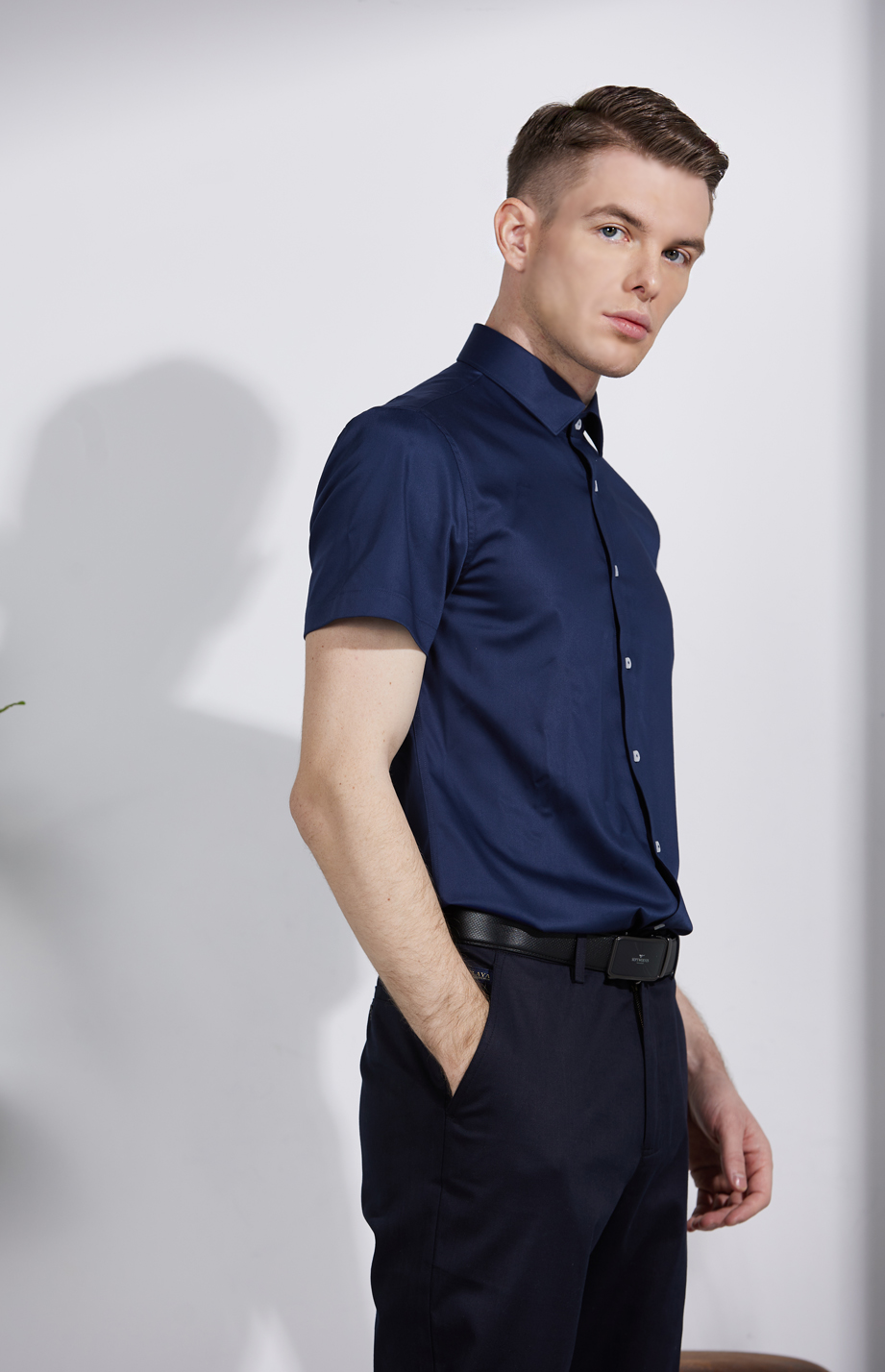 | 款名: | 深蓝色竹纤维聚酯纤维混纺短袖衬衫 | |||