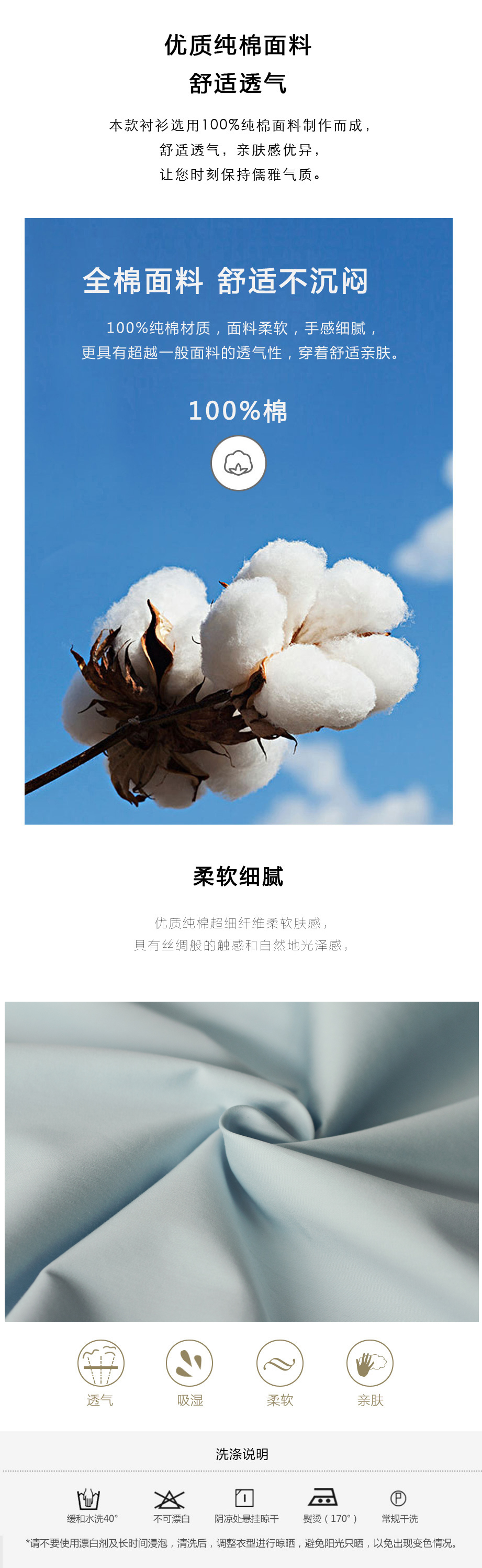 经典明门襟设计;专用定制纽扣,精致耐用,车线精密走针,不易脱落。