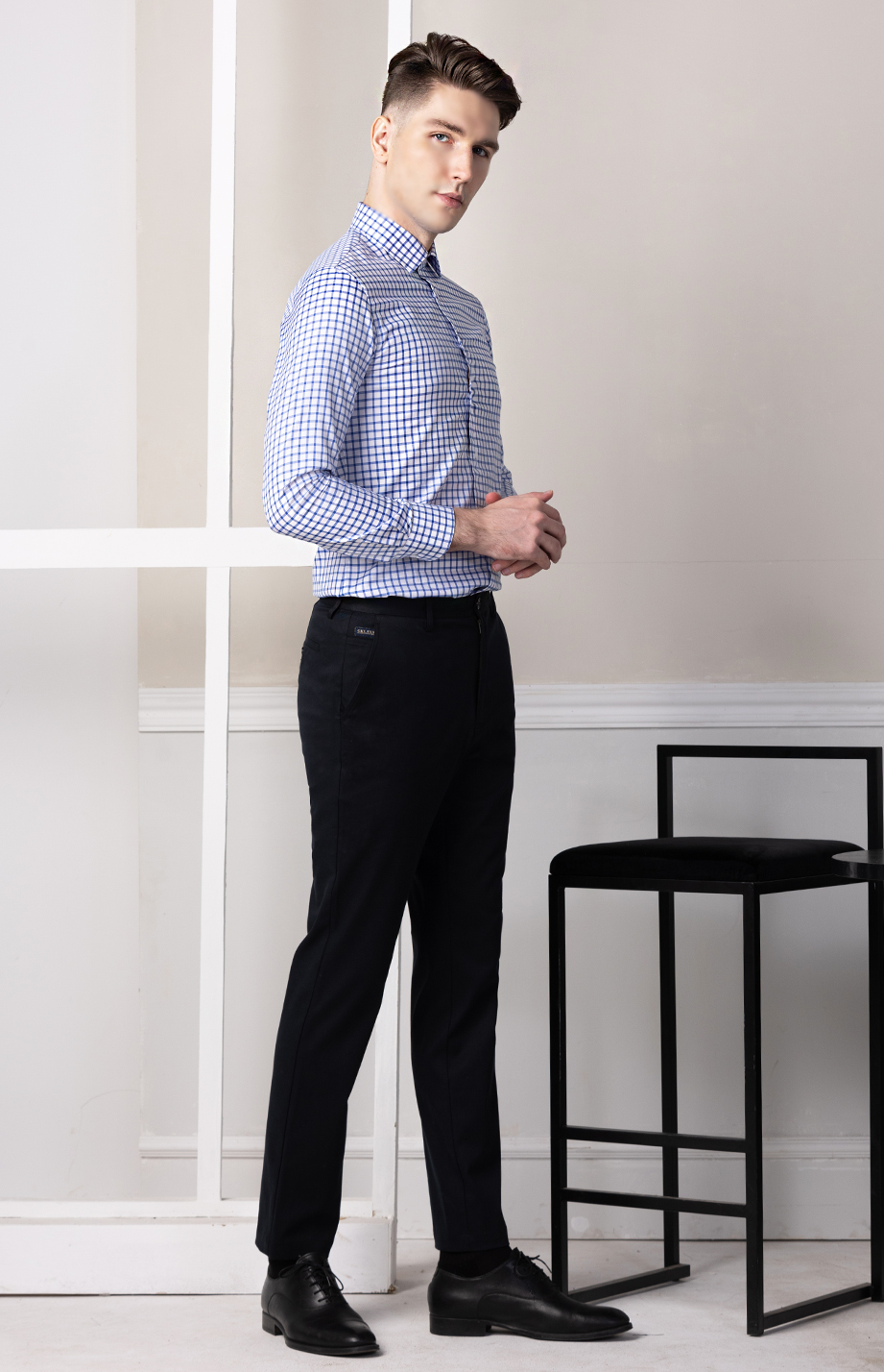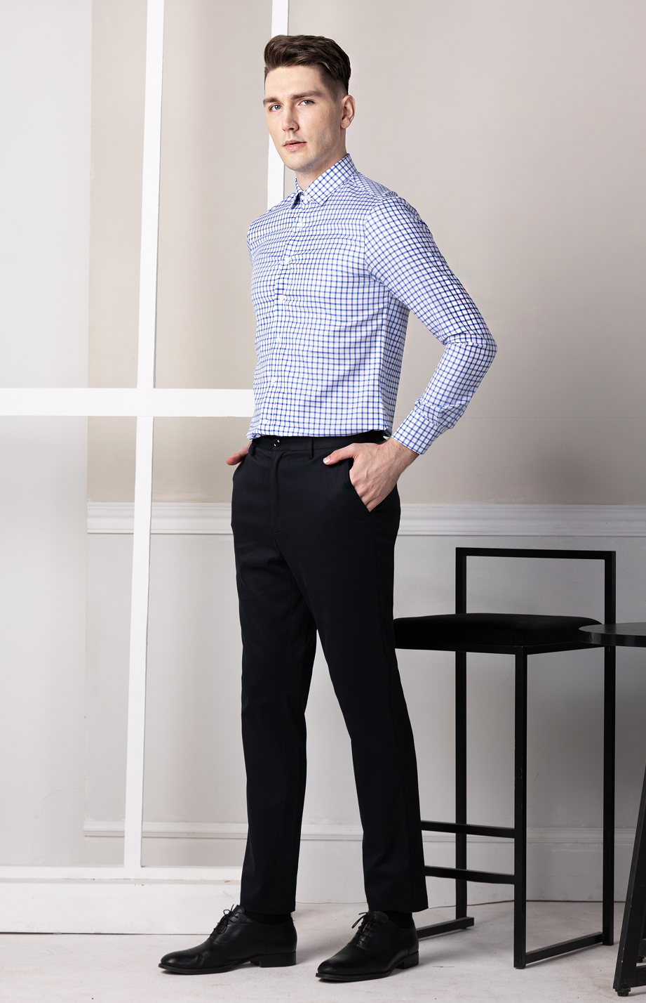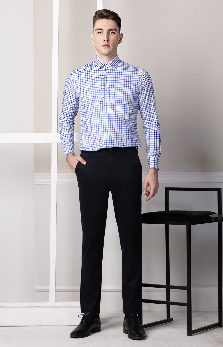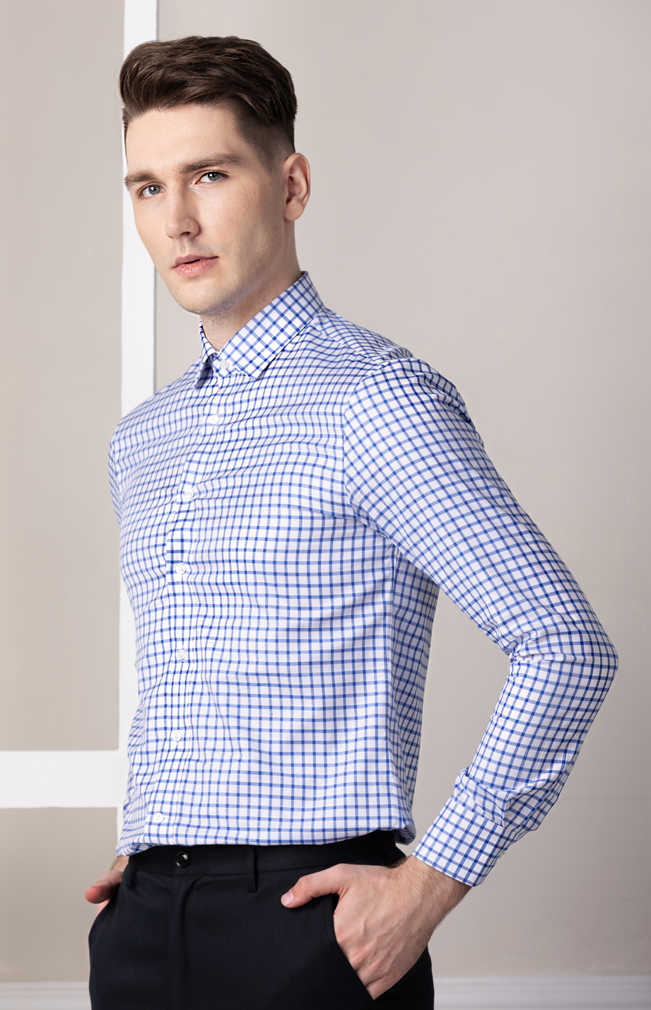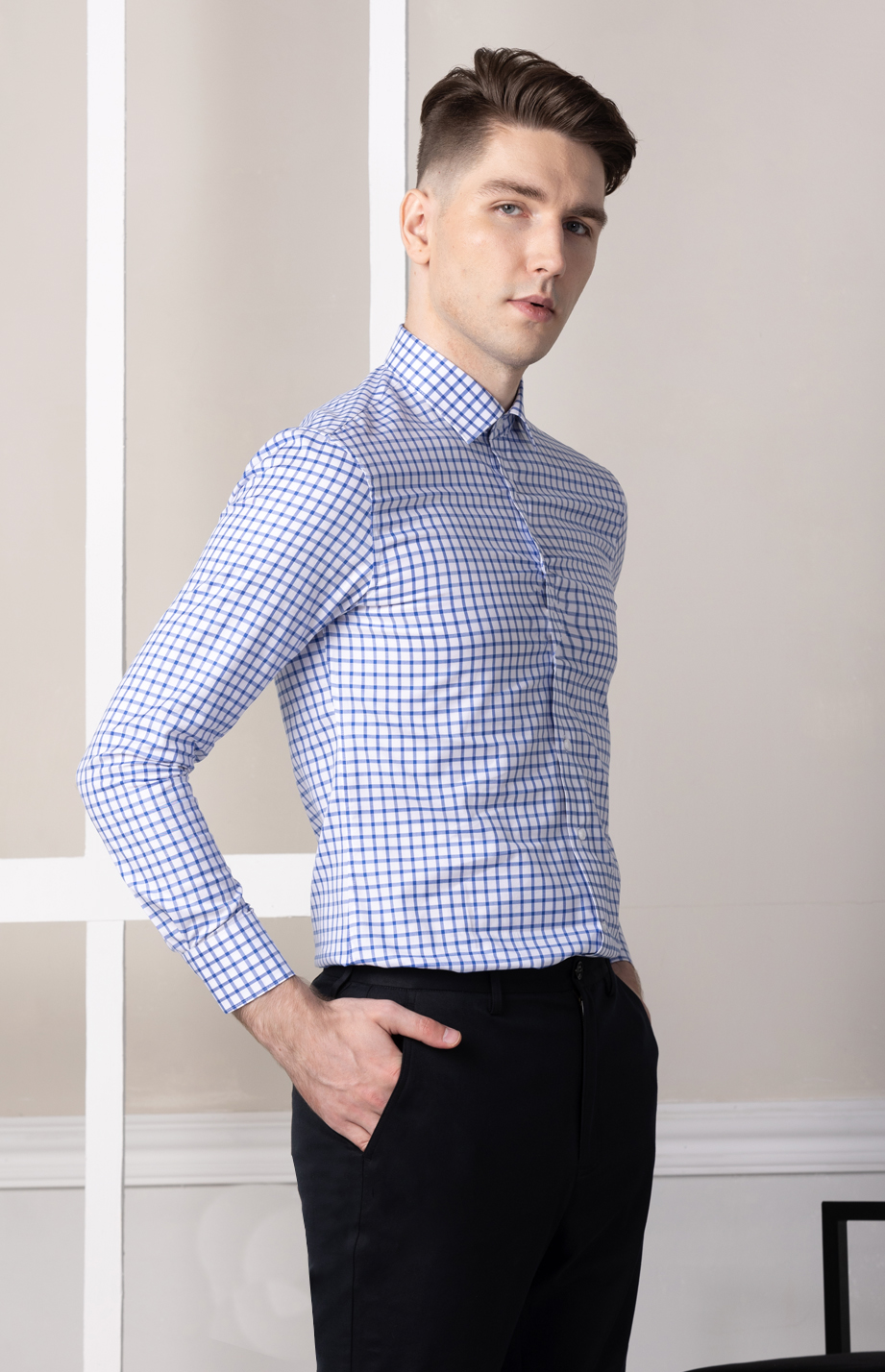 | 款名: | 白底宝蓝格120支纯棉商务长袖衬衫 | |||