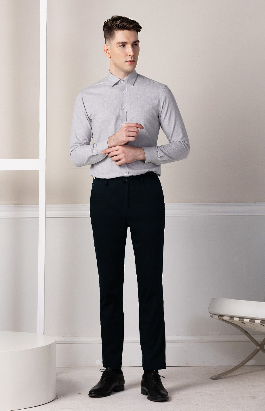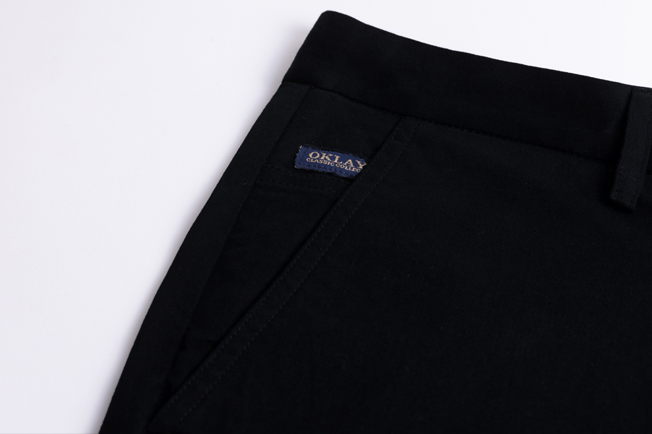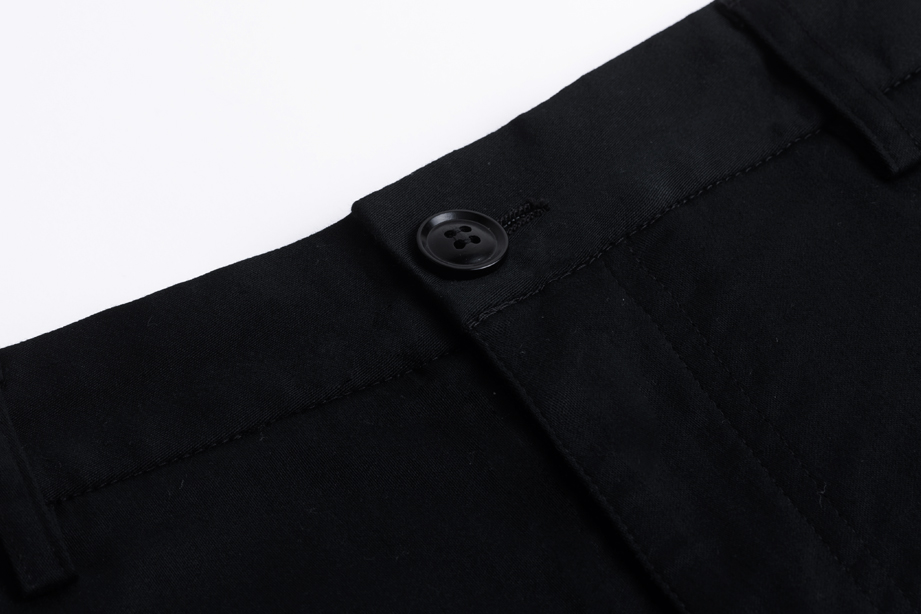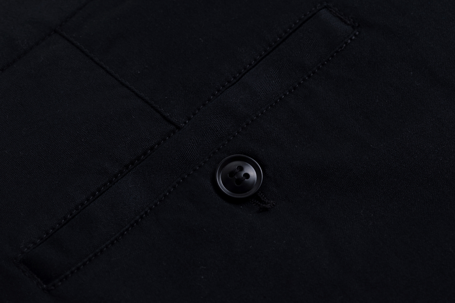 经典腰头设计,平整有型;圆润富有光泽的树脂纽扣,精致美观,十字走线防脱落。