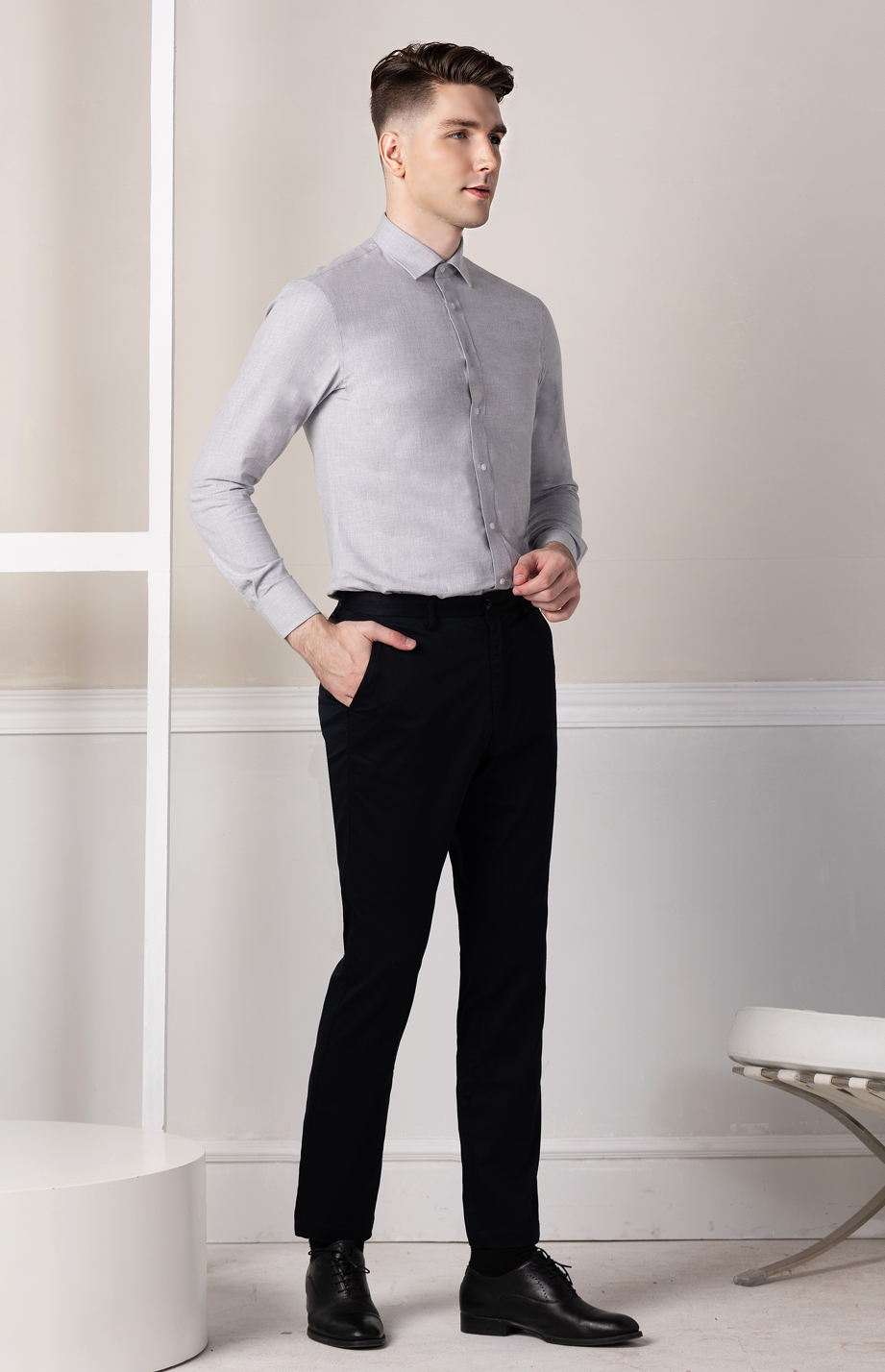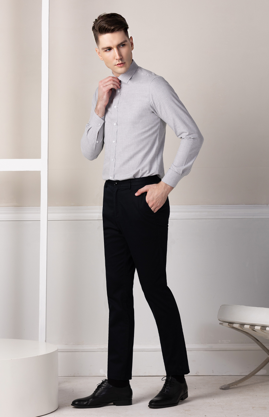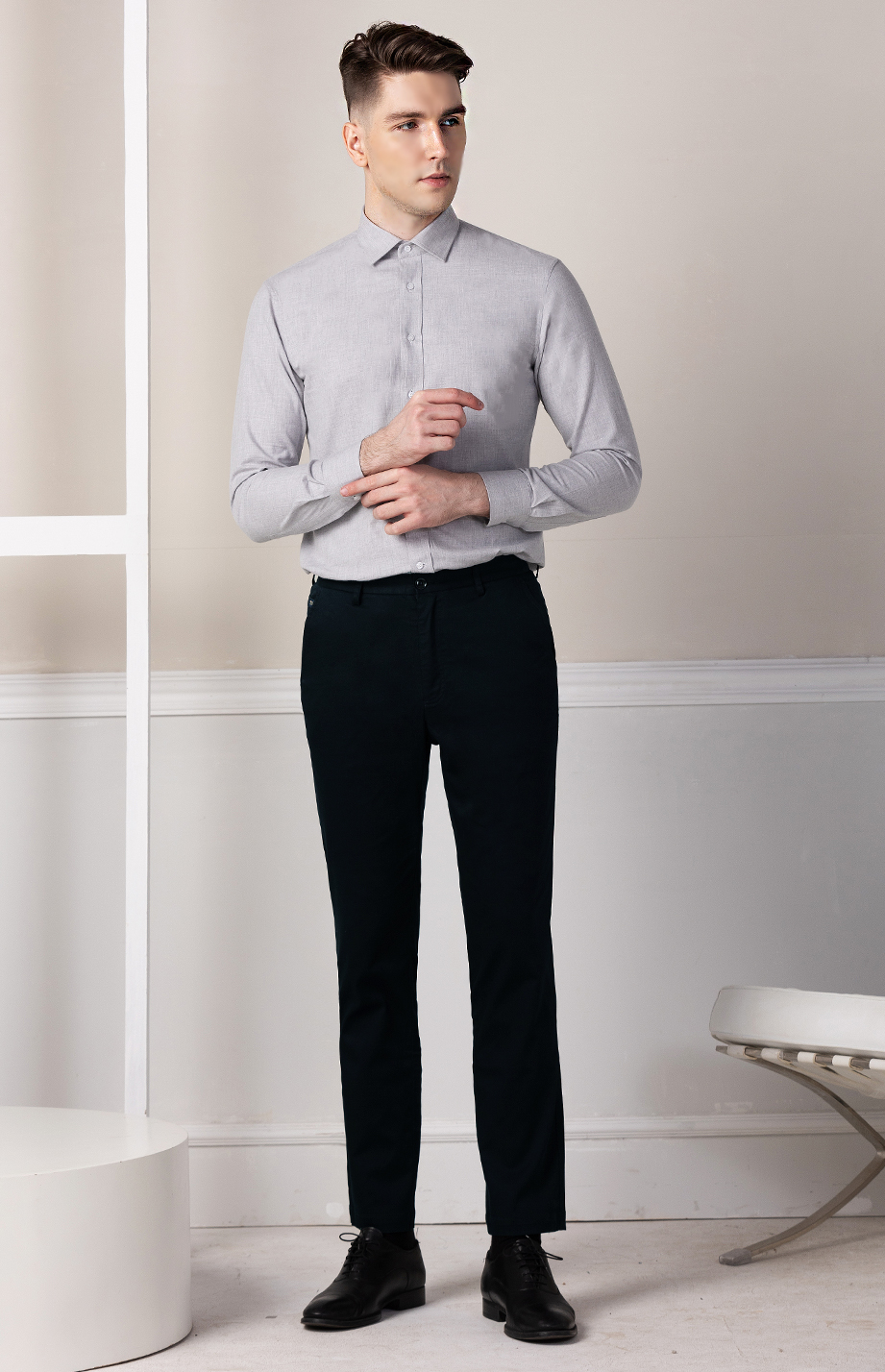 经典腰头设计,平整有型;圆润富有光泽的树脂纽扣,精致美观,十字走线防脱落。