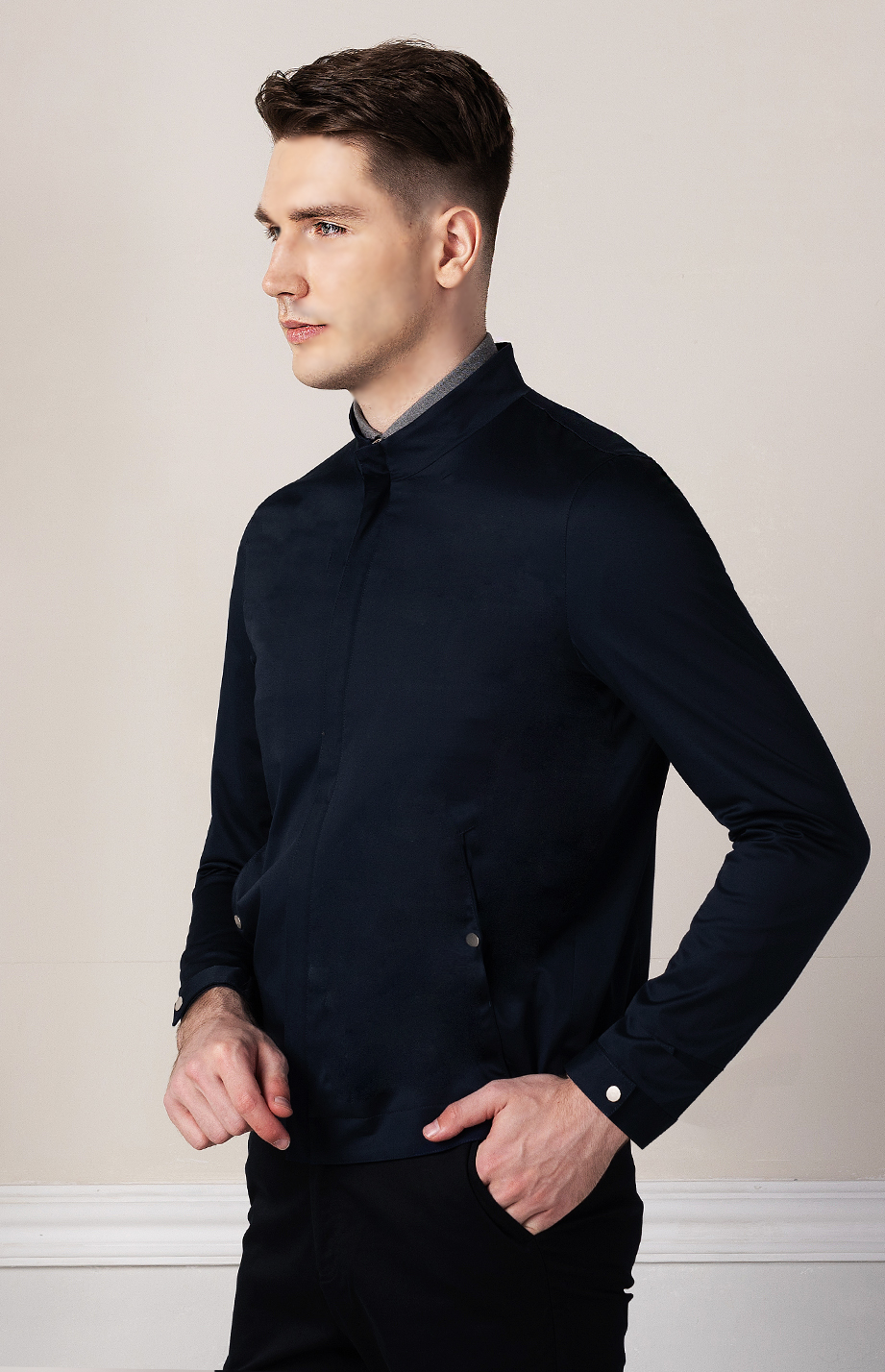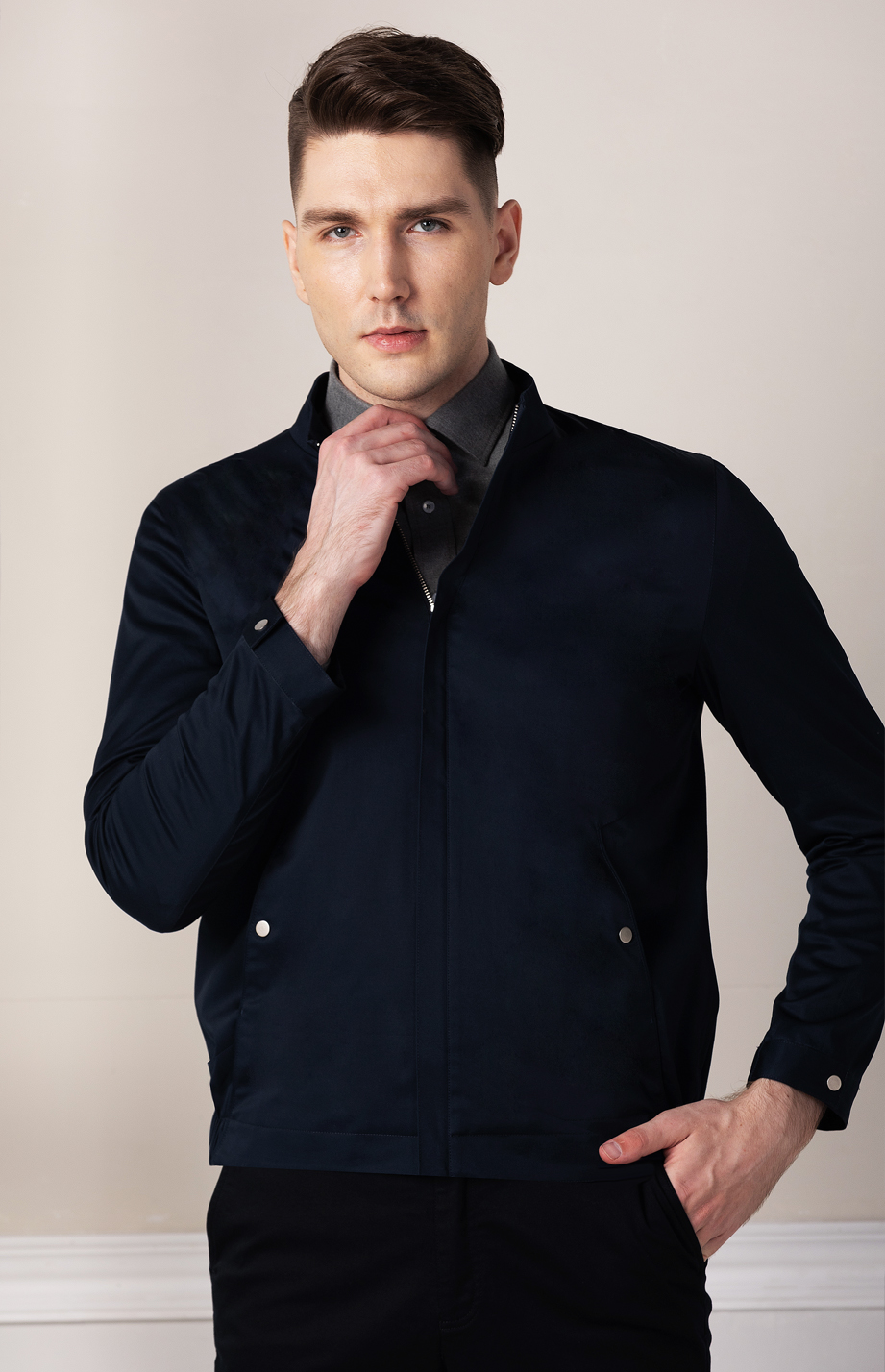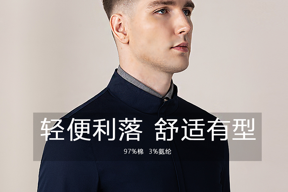 | 款名: | 藏蓝色纯棉微弹立领商务休闲茄克 | |||||