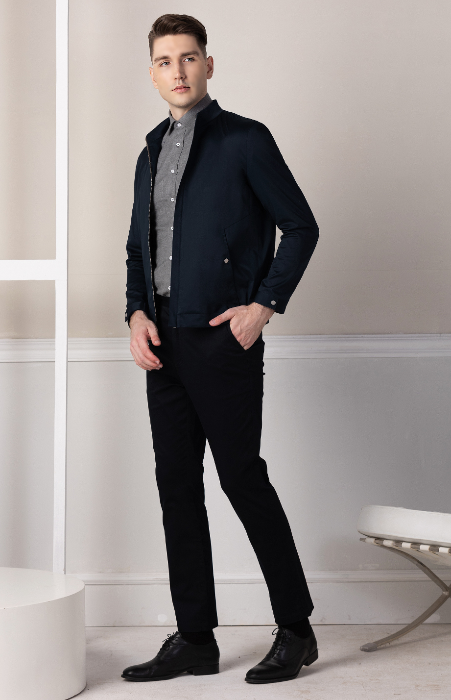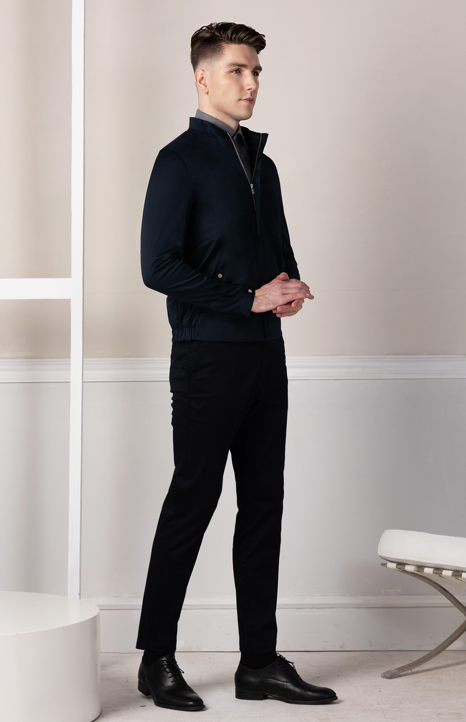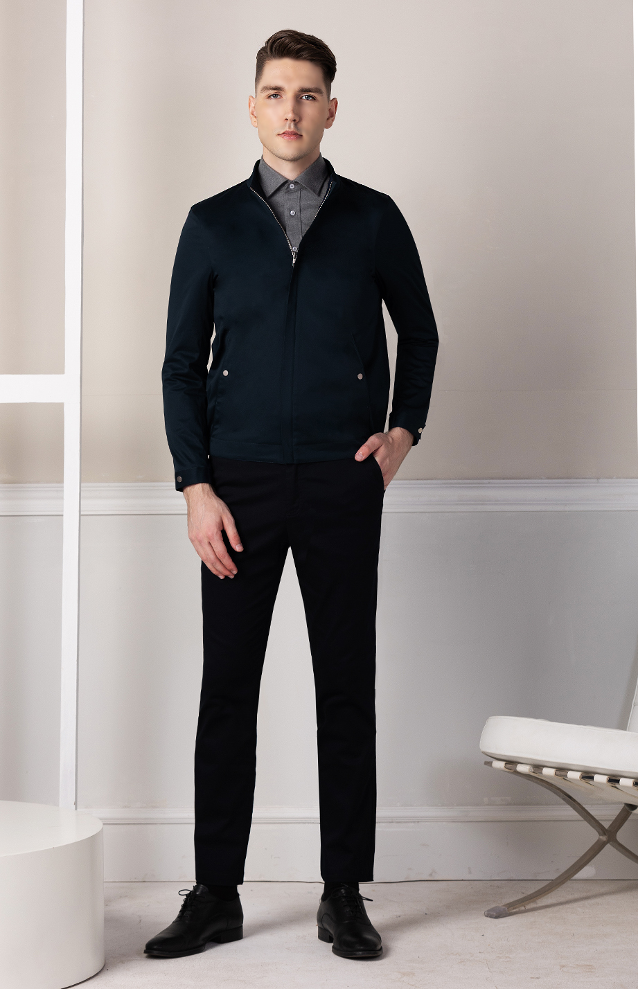 | 款名: | 藏蓝色纯棉微弹立领商务休闲茄克 | |||||