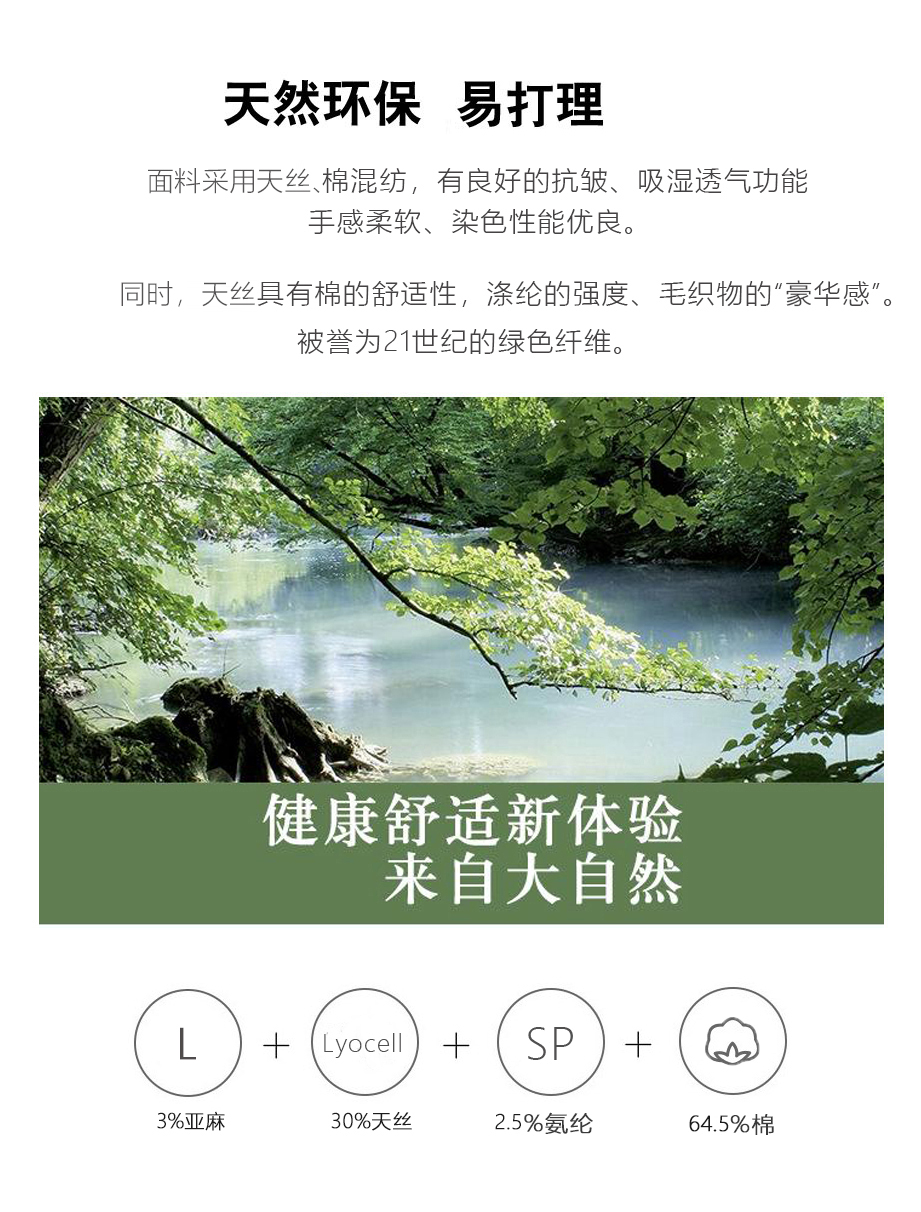 | 面料: | 30%天丝64.5%棉3%亚麻2.5%氨纶 | |||