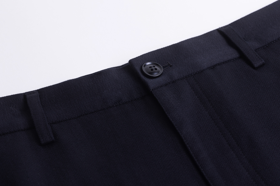经典腰头设计,平整有型;圆润富有光泽的树脂纽扣,精致美观,十字走线防脱落。