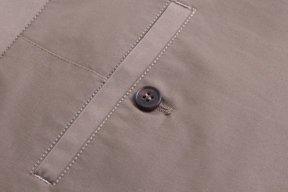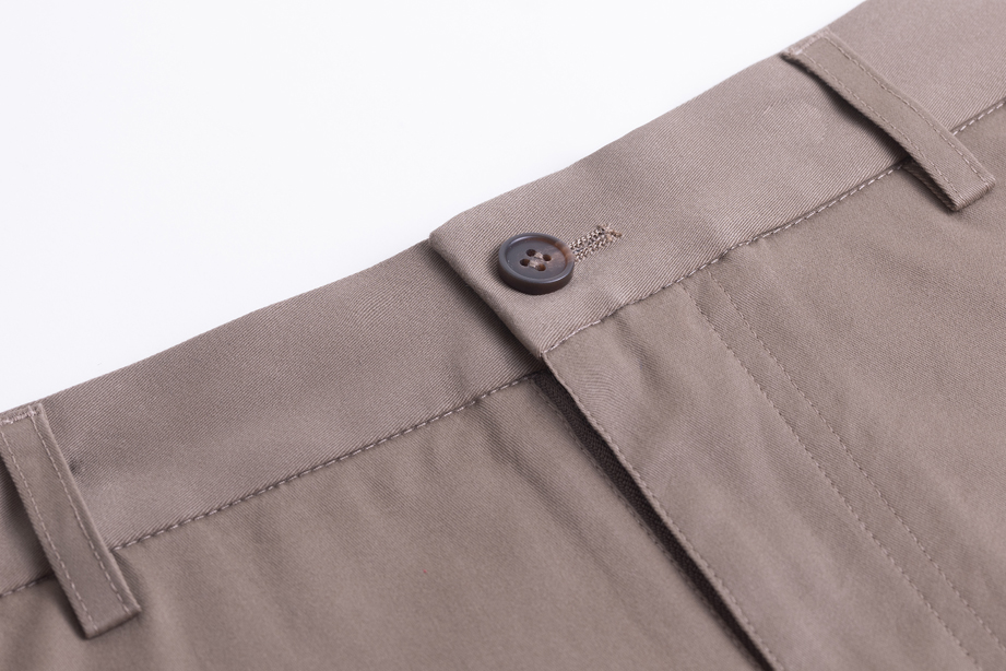 经典腰头设计,平整有型;圆润富有光泽的树脂纽扣,精致美观,十字走线防脱落。