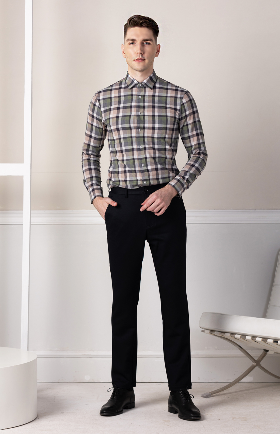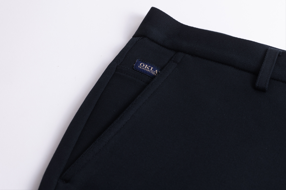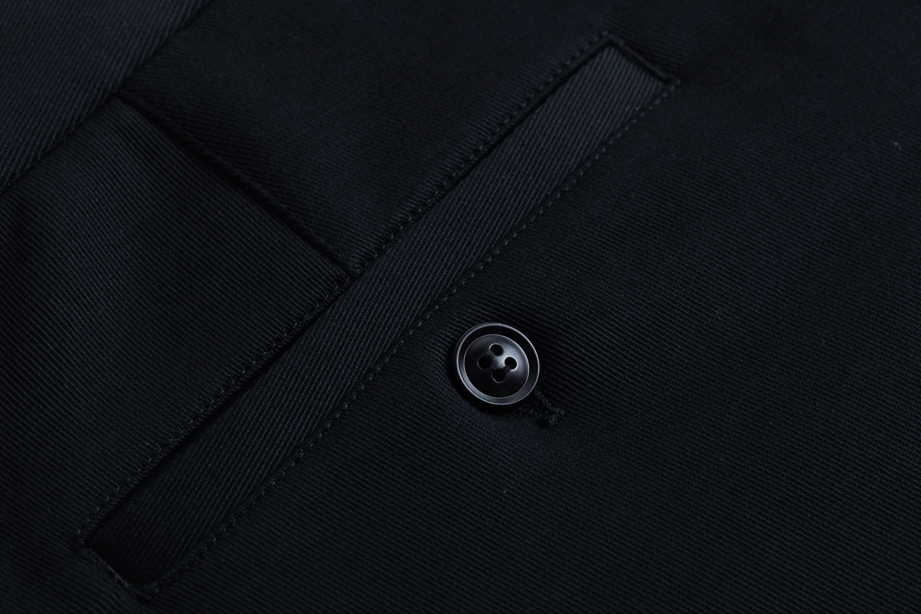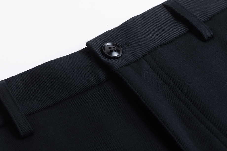经典腰头设计,平整有型;圆润富有光泽的树脂纽扣,精致美观,十字走线防脱落。