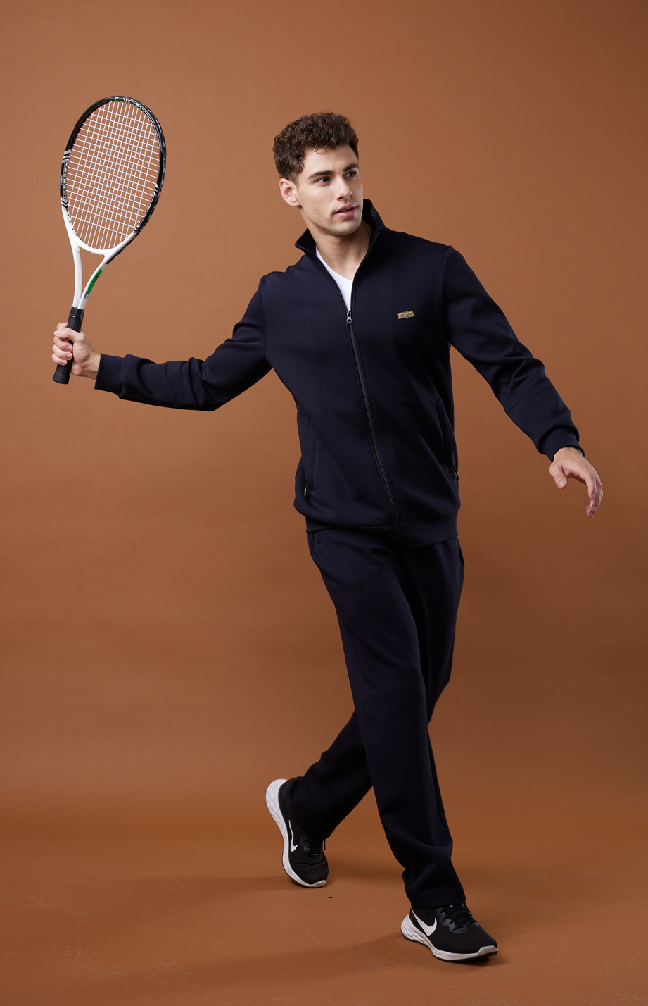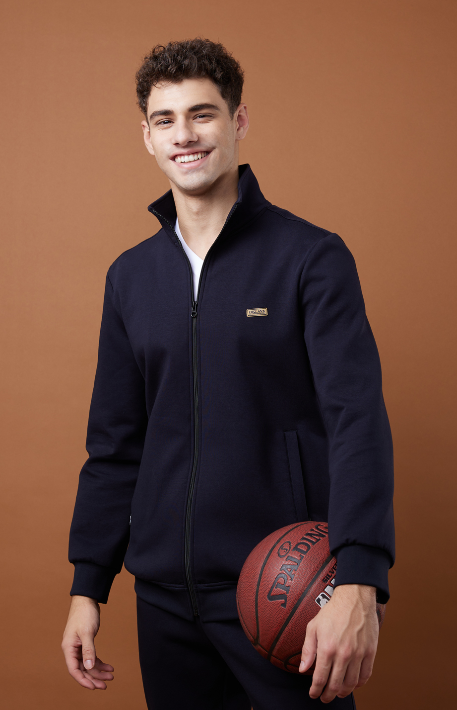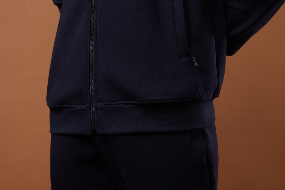 深藏蓝针织棉涤混纺立翻两用领春秋运动装上衣 |