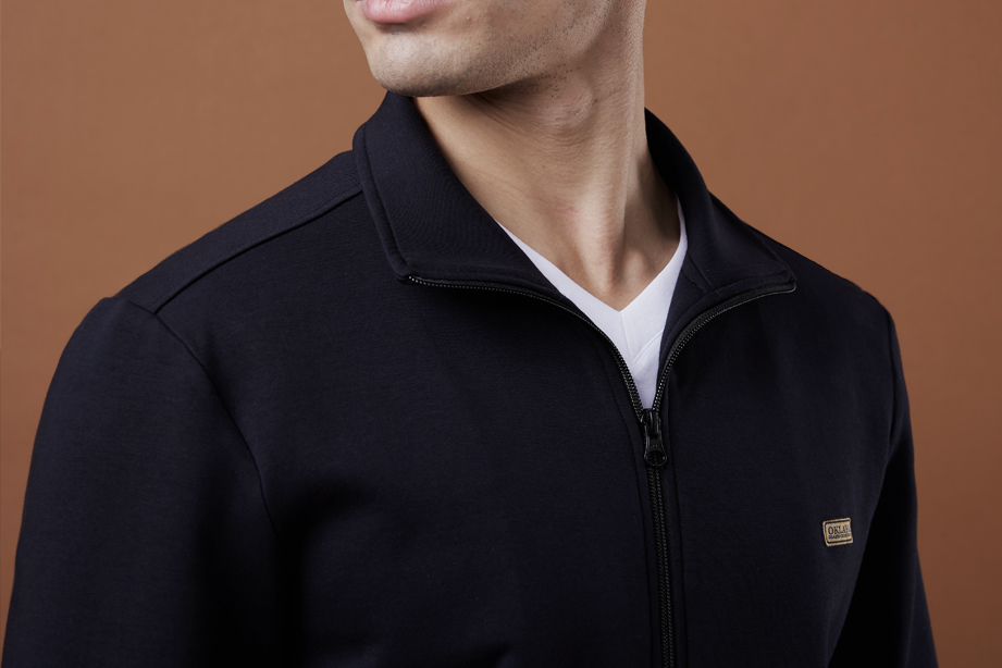 | 款名: | 深藏蓝针织棉涤混纺立翻两用领春秋运动装上衣 | |||