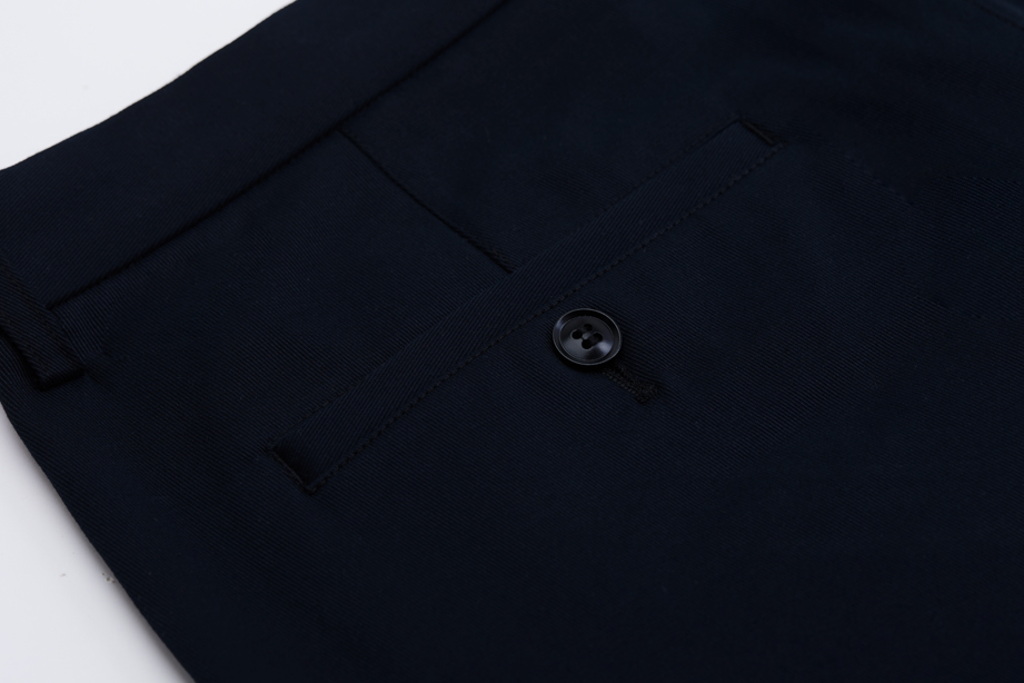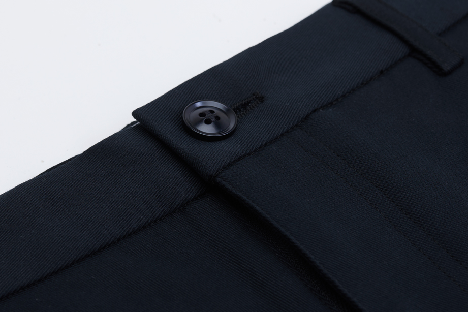 经典腰头设计,平整有型;圆润富有光泽的树脂纽扣,精致美观,十字走线防脱落。