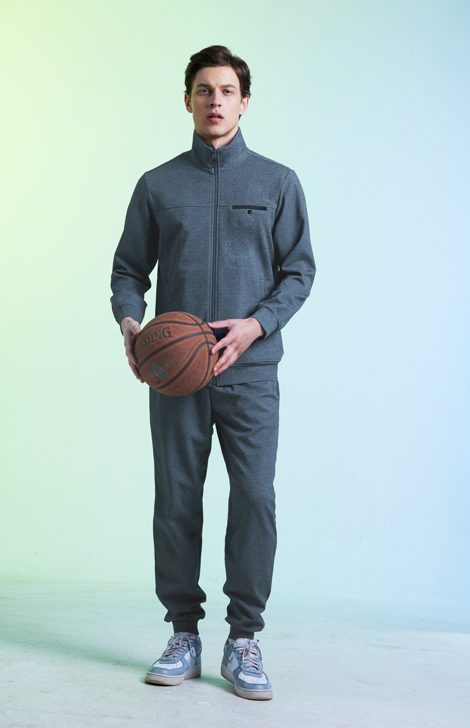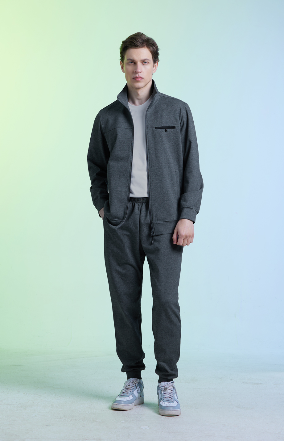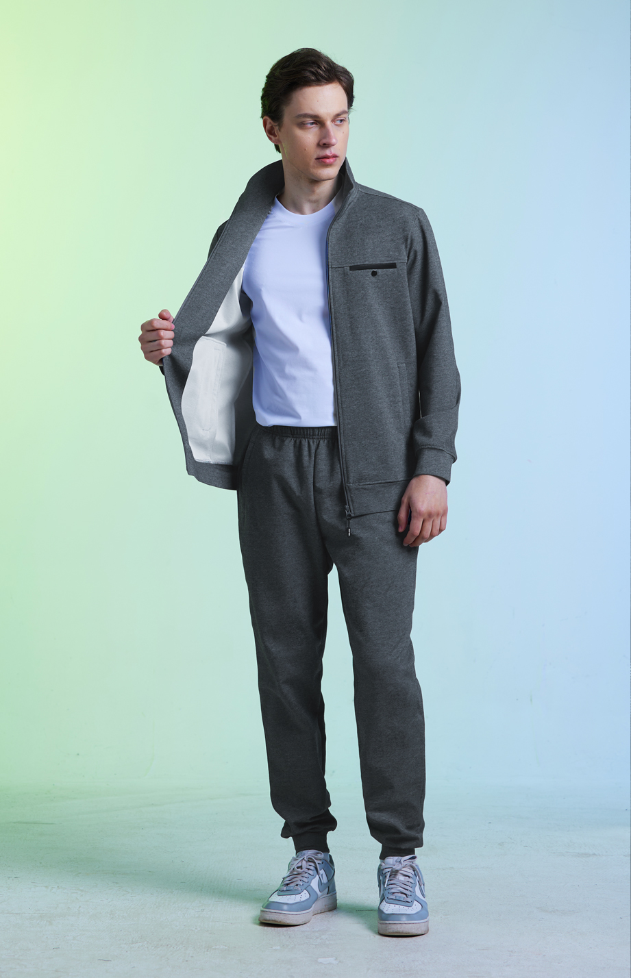 | 款名: | 深灰色棉聚酯纤维混纺胸兜拼色立翻领春夏秋运动装上衣 | |||