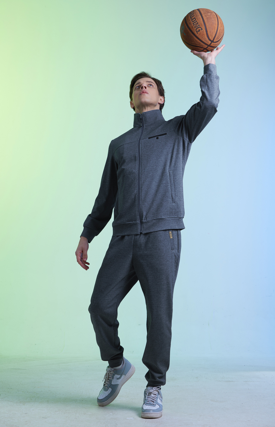 深灰色棉聚酯纤维混纺胸兜拼色立翻领春夏秋运动装上衣 |