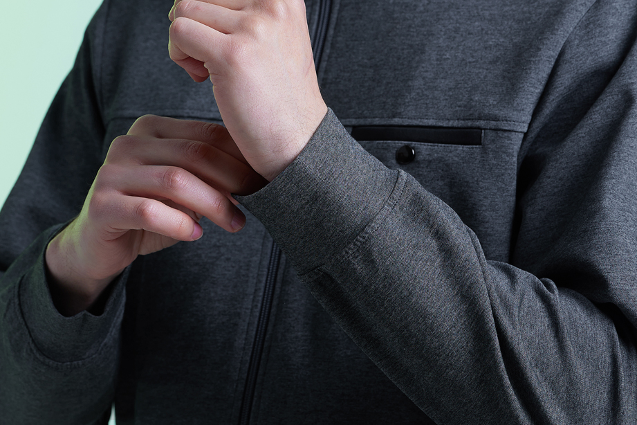 袖头使用简洁的顺色针织罗纹,舒适又有型。