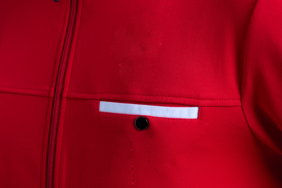 前胸做分割、拼色带扣胸兜的设计让衣服更有动感,更实用。