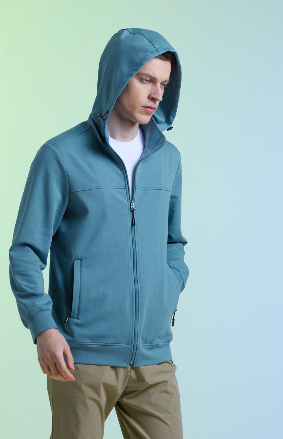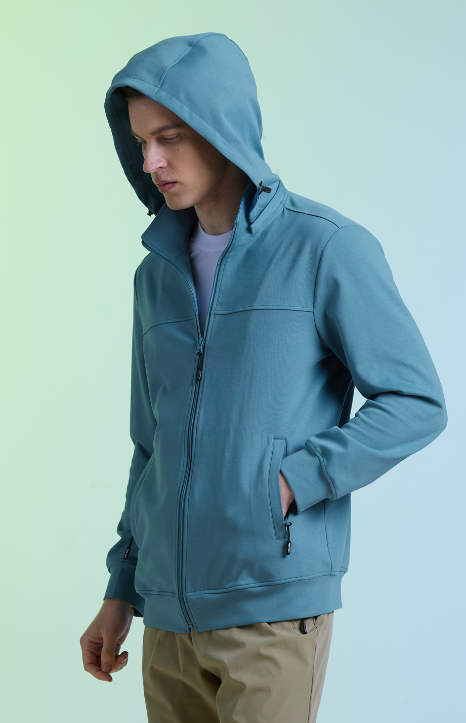 蓝灰色棉聚酯纤维混纺时尚运动休闲帽衫(帽可拆卸) |