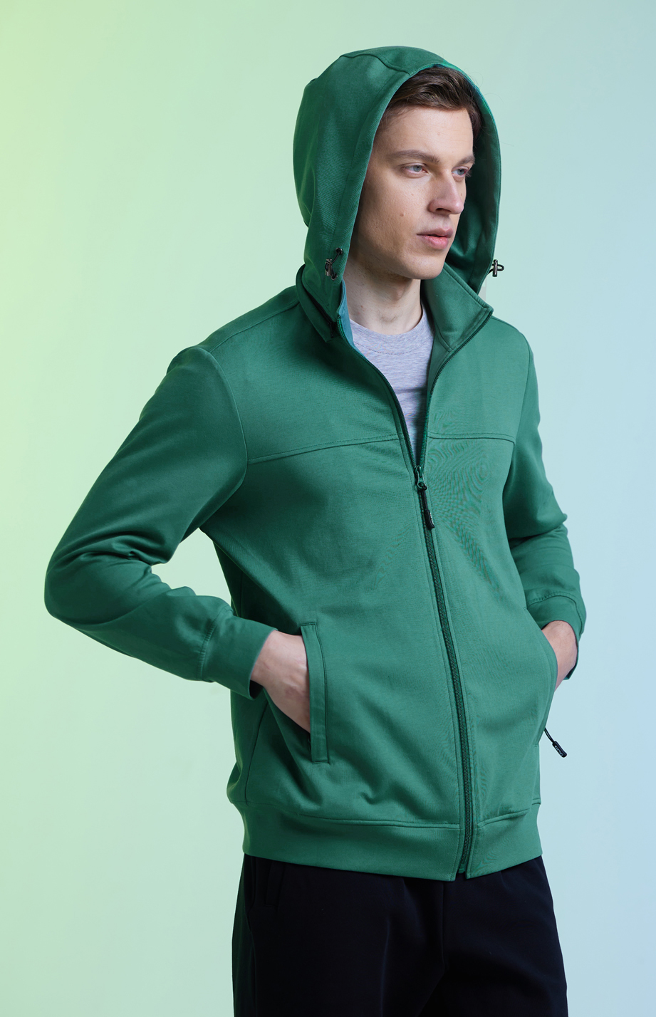 深宝石绿色棉聚酯纤维混纺时尚运动休闲帽衫(帽可拆卸) |