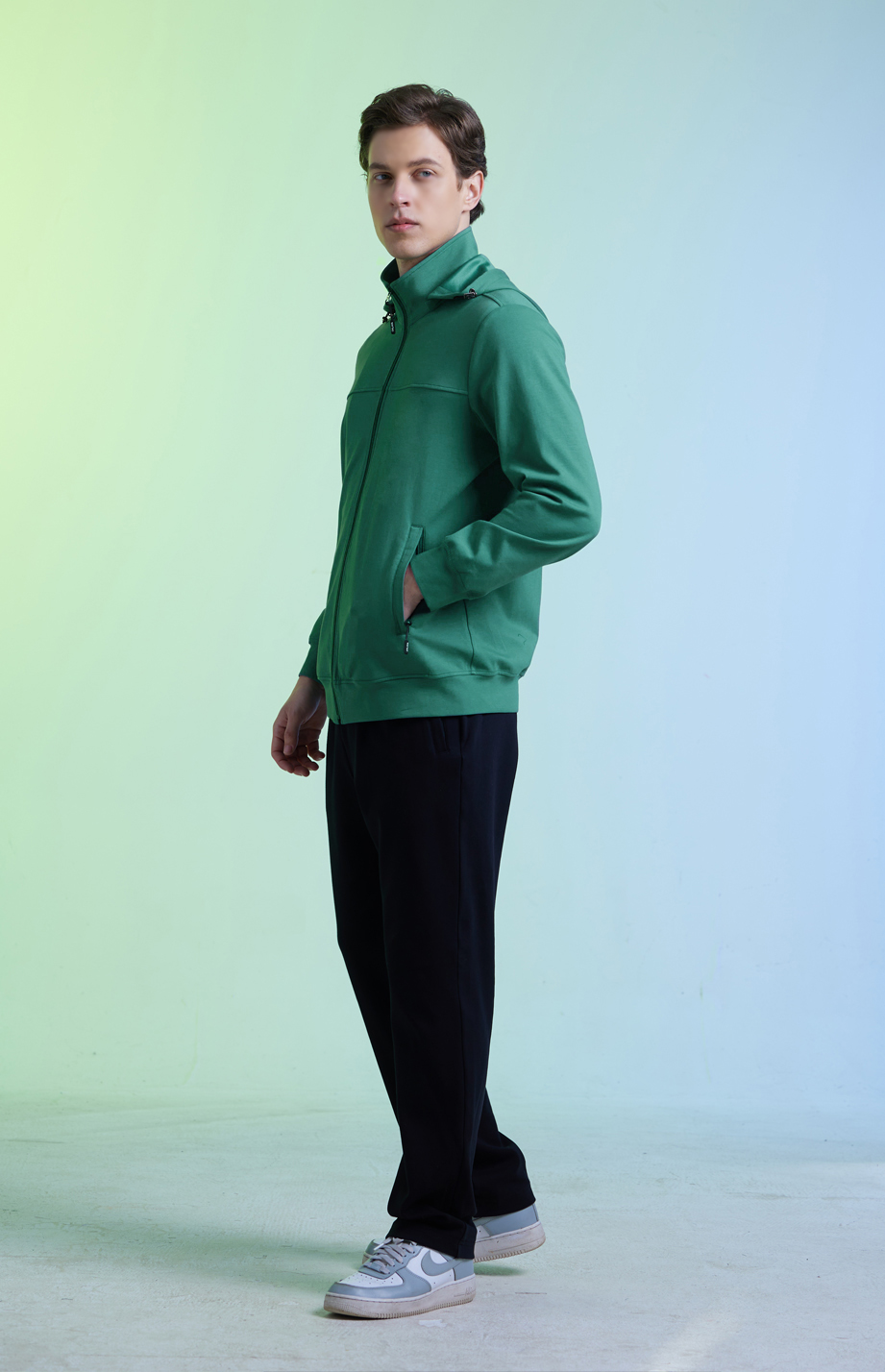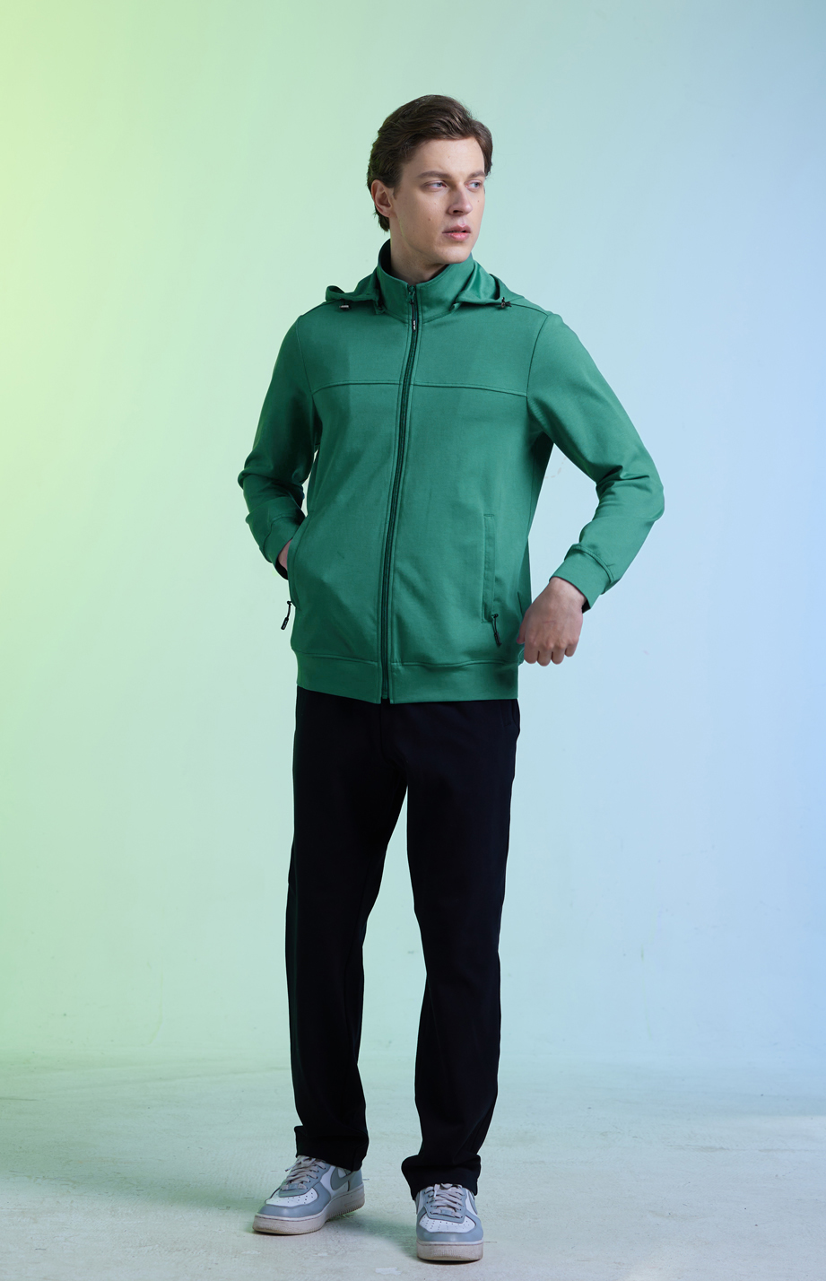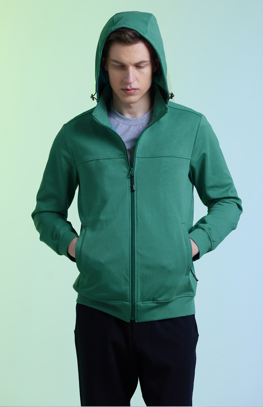 | 款名: | 深宝石绿色棉聚酯纤维混纺时尚运动休闲帽衫(帽可拆卸) | |||