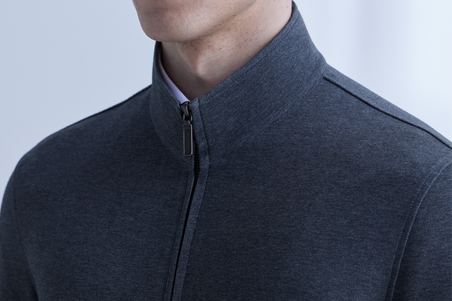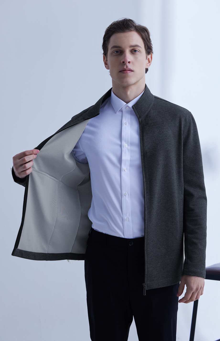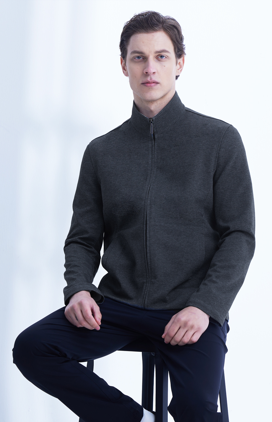 深花灰色棉聚酯纤维混纺针织立领商务茄克 |