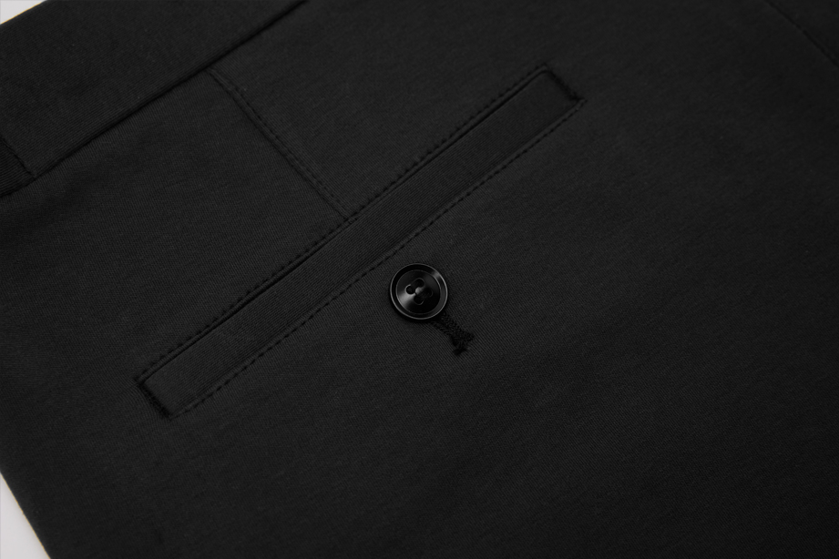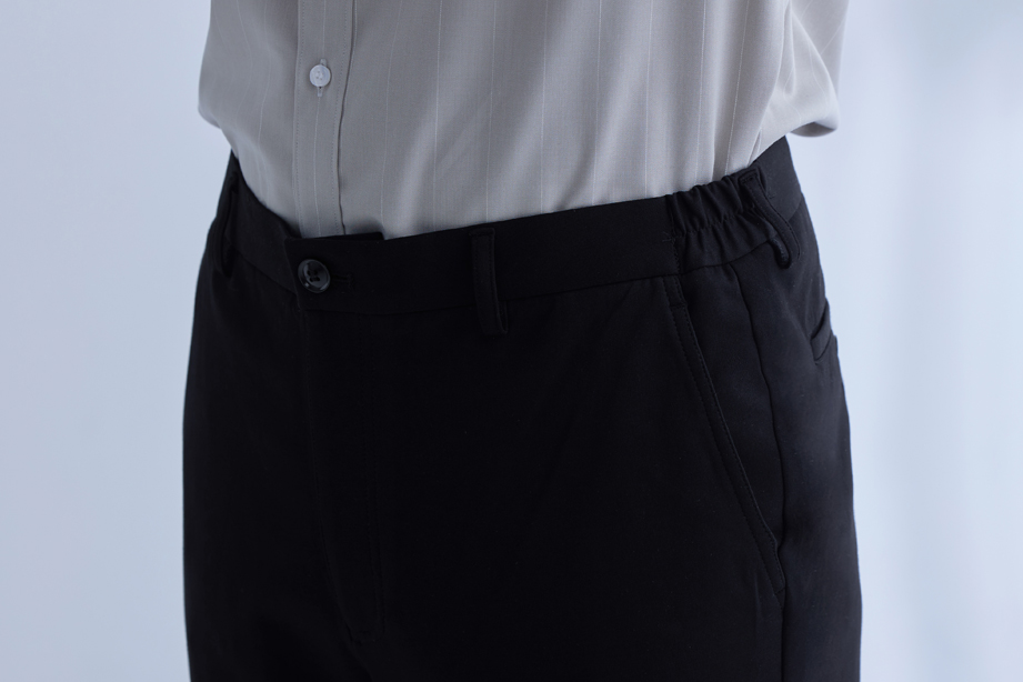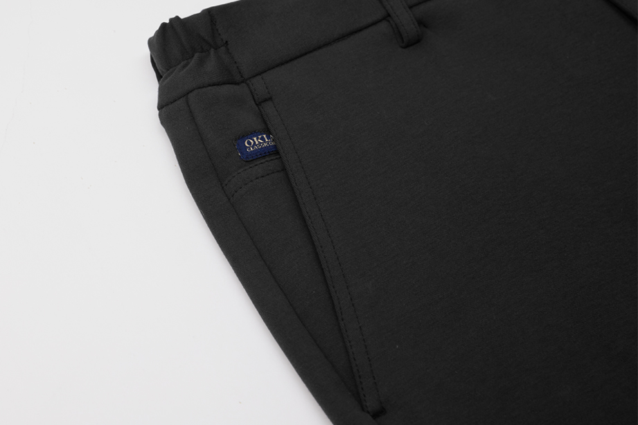 经典腰头设计,系扣带拉链,安全稳固、简洁实用,腰两侧加松紧便于日常穿脱调节要部尺寸。