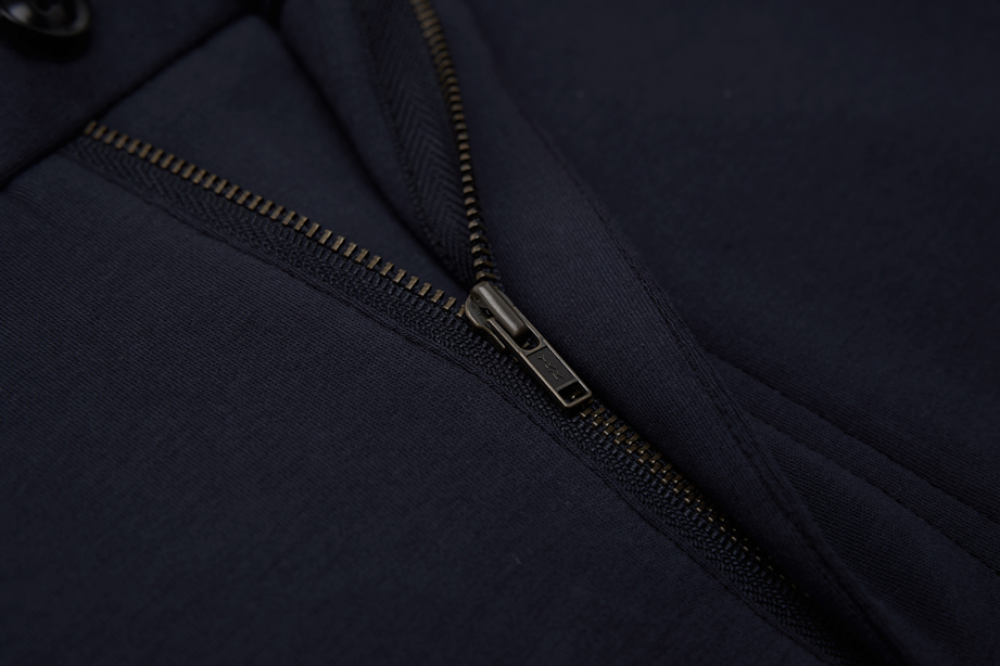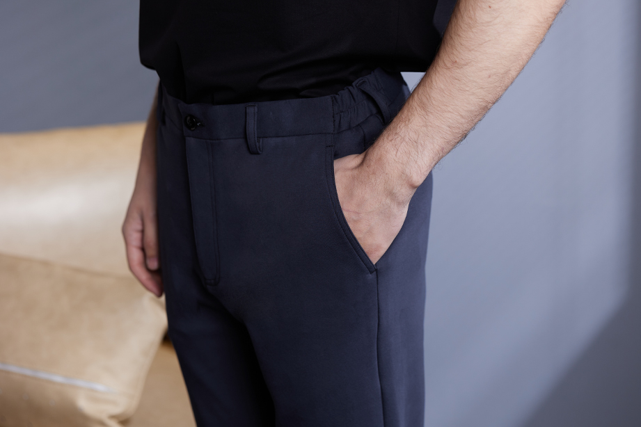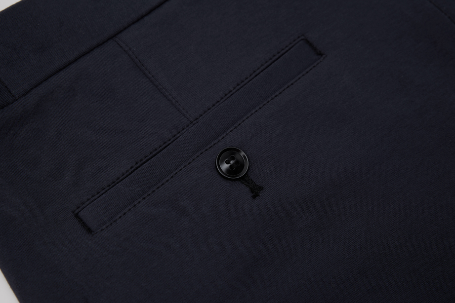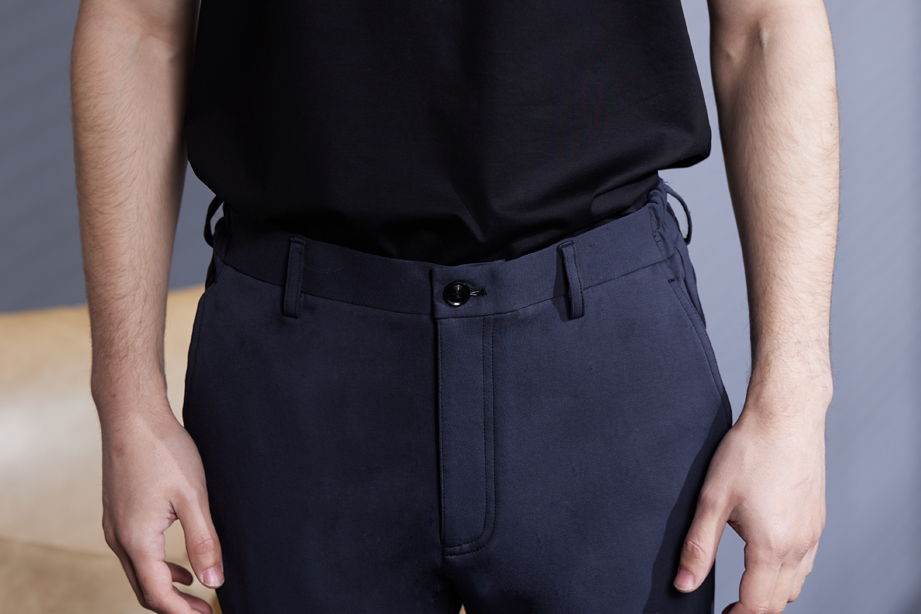 经典腰头设计,系扣带拉链,安全稳固、简洁实用,腰两侧加松紧便于日常穿脱调节要部尺寸。