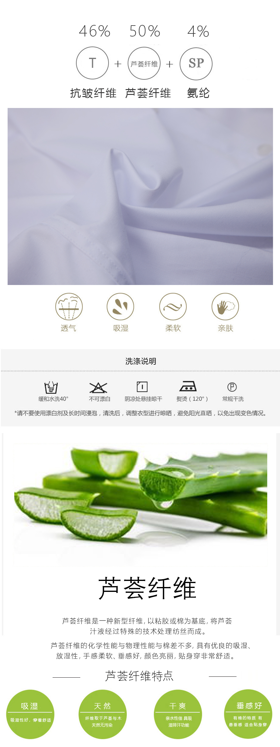 | 面料: | 50%芦荟纤维46%抗皱纤维4%氨纶 | |||