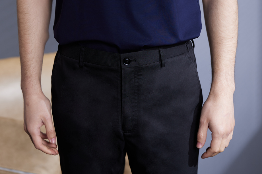 经典腰头设计,系扣带拉链,安全稳固、简洁实用,腰两侧加松紧便于日常穿脱调节要部尺寸。