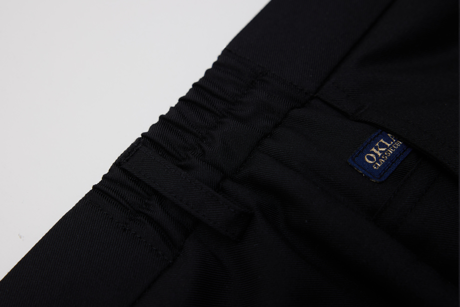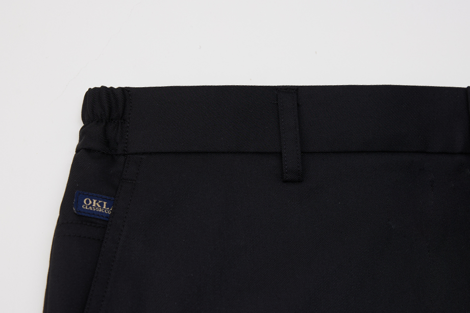 经典腰头设计,系扣带拉链,安全稳固、简洁实用,腰两侧加松紧便于日常穿脱调节要部尺寸。