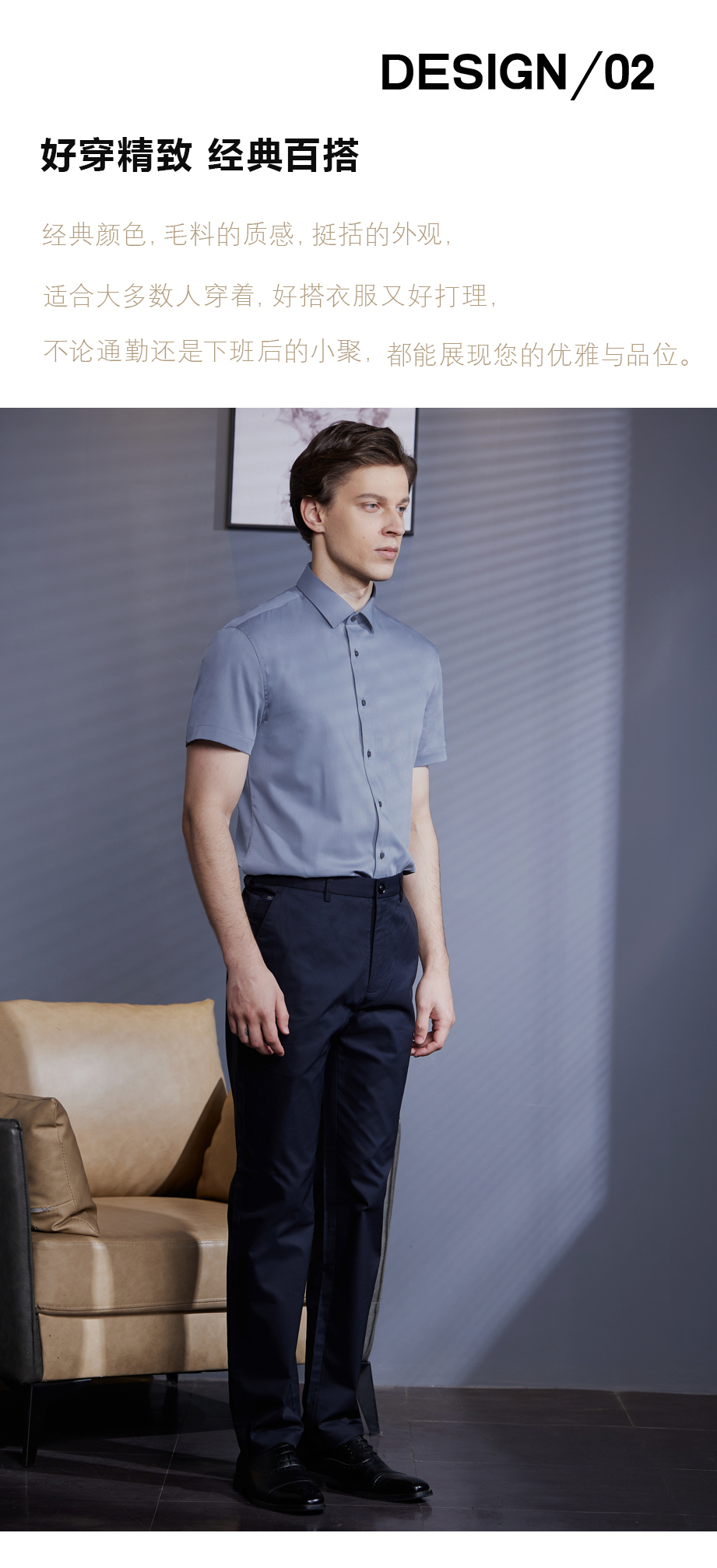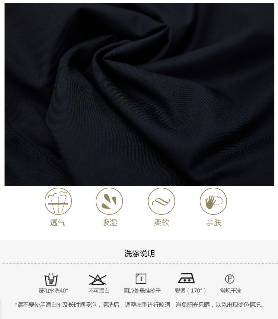 经典腰头设计,平整有型;圆润富有光泽的树脂纽扣,精致美观,十字走线防脱落。