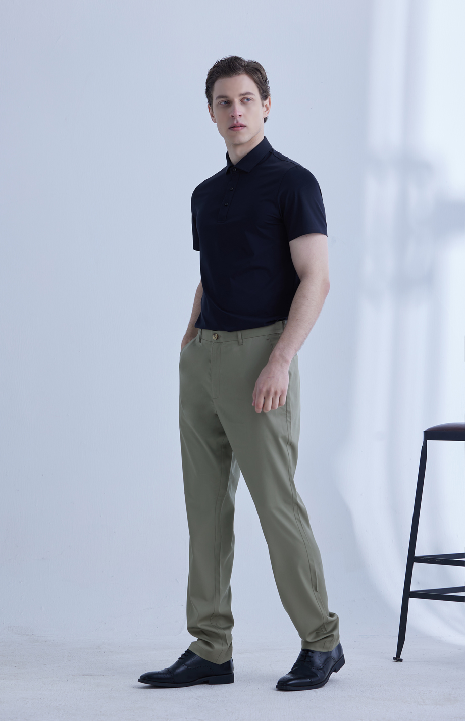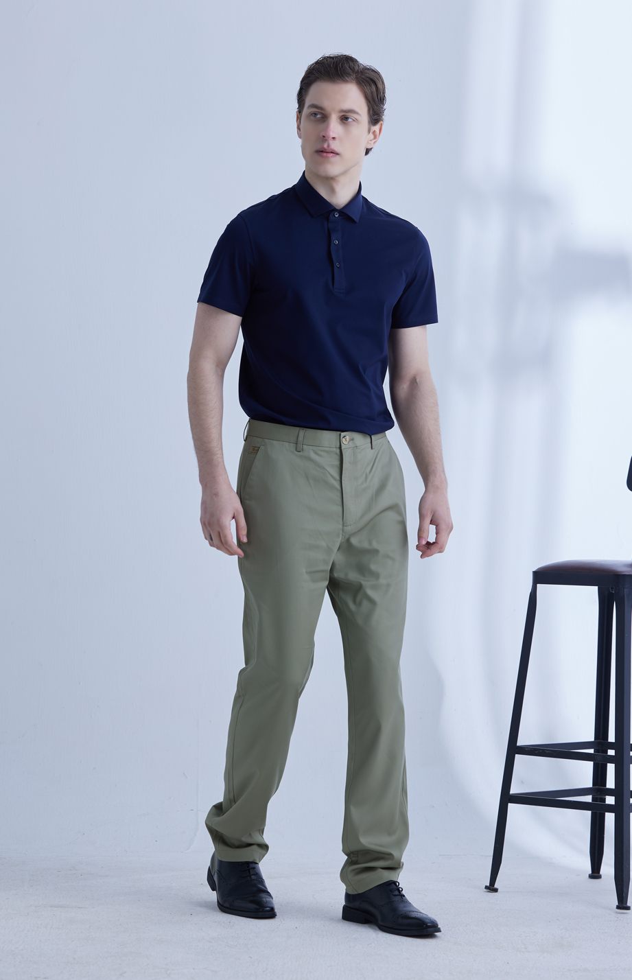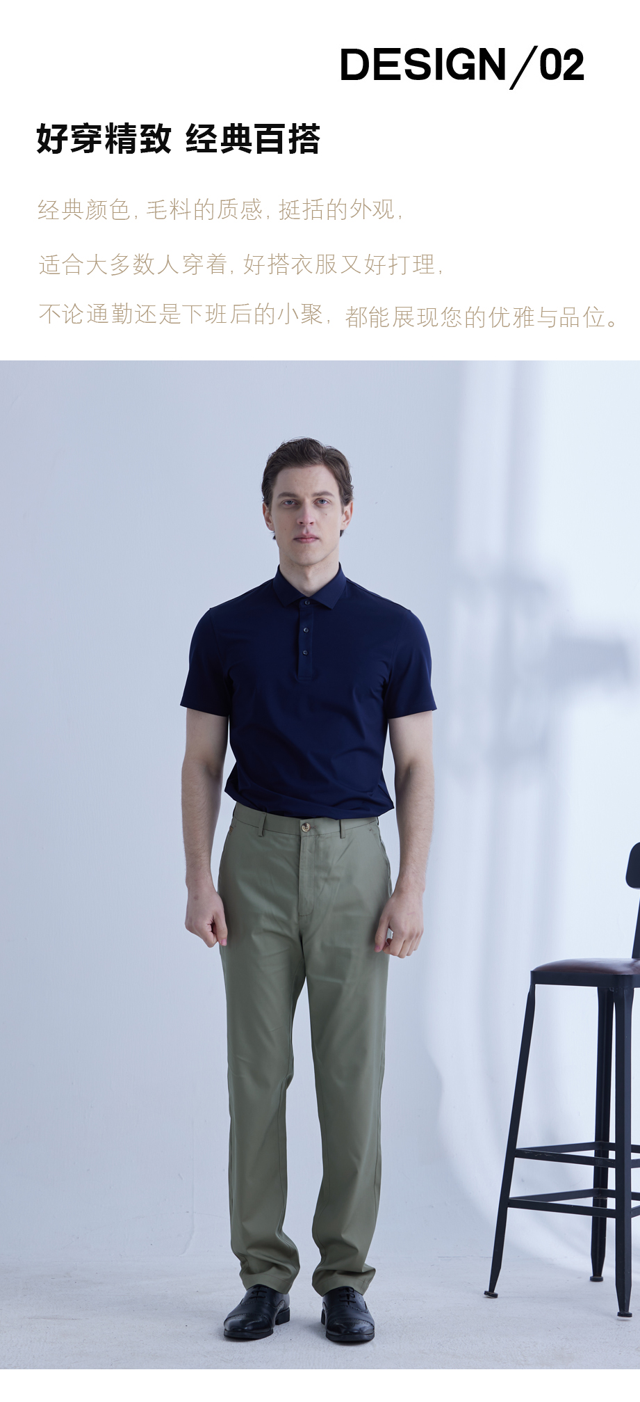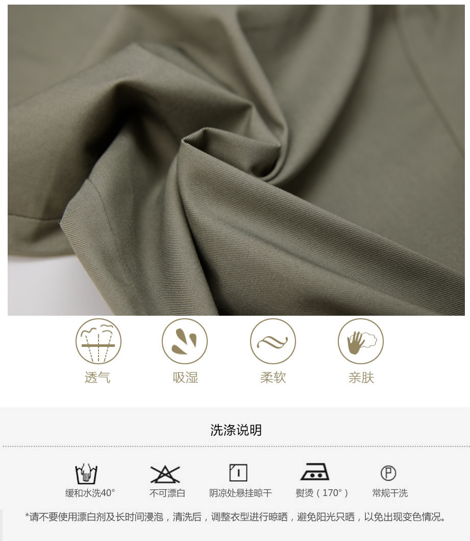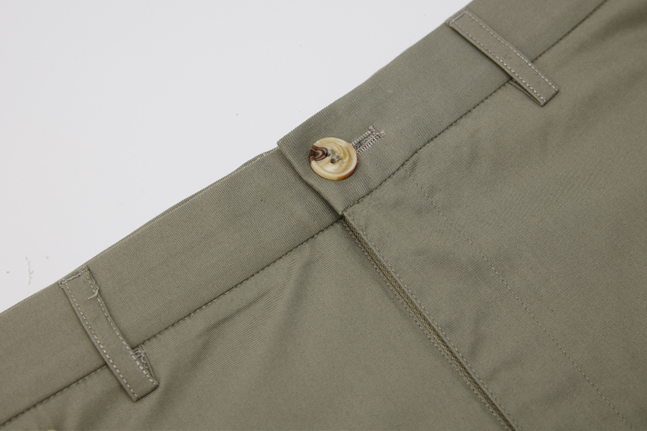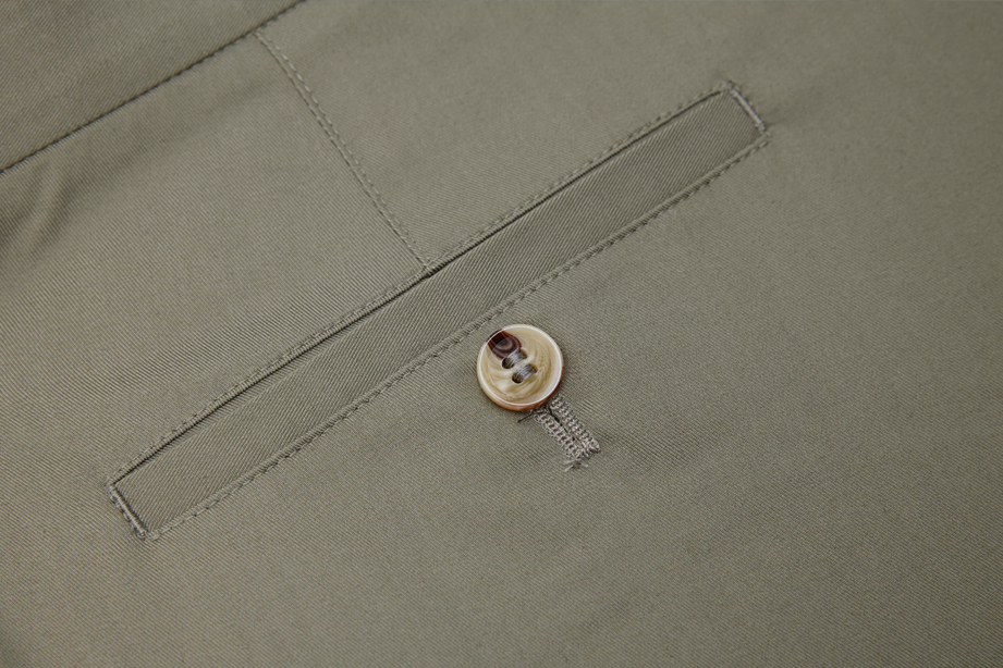 经典腰头设计,平整有型;圆润富有光泽的树脂纽扣,精致美观,十字走线防脱落。