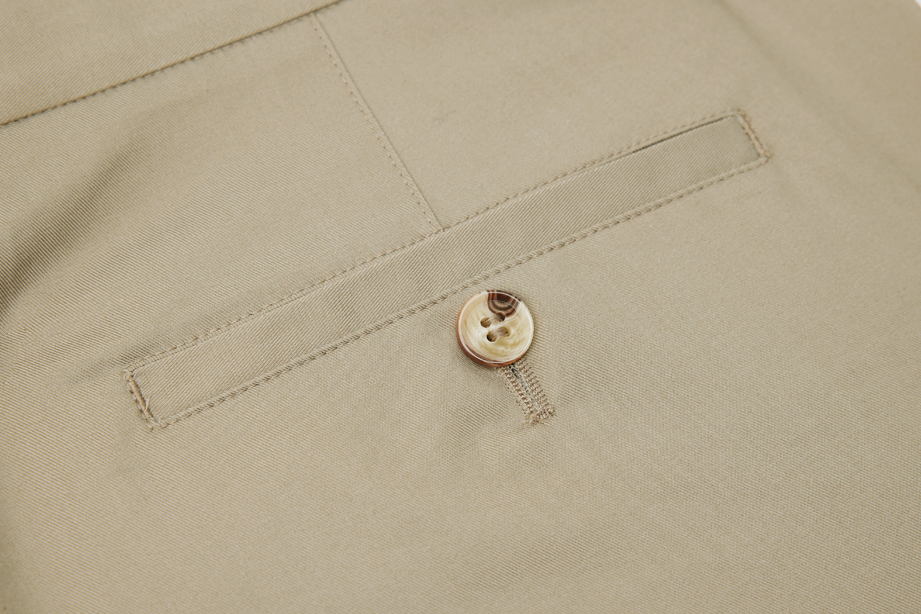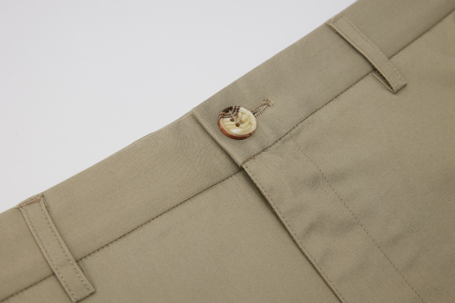 经典腰头设计,平整有型;圆润富有光泽的树脂纽扣,精致美观,十字走线防脱落。